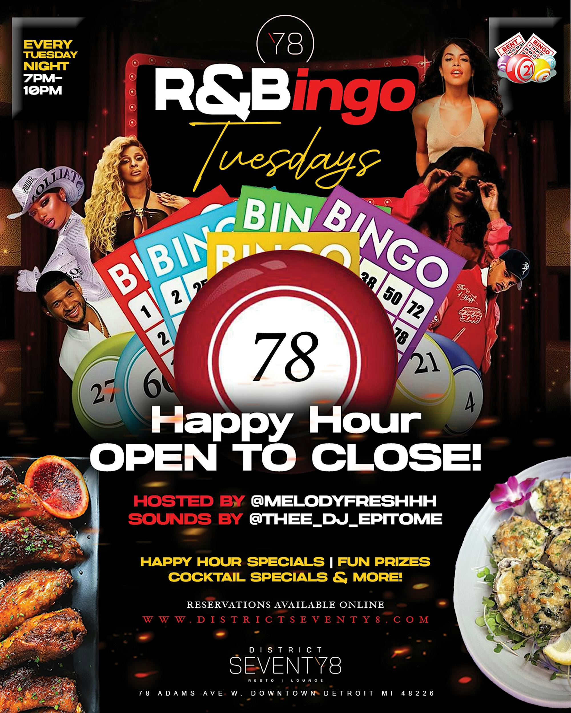 Bent Bingo Happy Hour R&Bingo at 78 Social Detroit – Detroit, MI Bent Bingo Happy Hour R&Bingo at 78 Social Detroit – Detroit, MI 2 2 people viewed this event. Tuesdays are now more fun than ever! Enjoy several fun rounds of music style bingo with a dynamic happy hour with apps & drinks. Tickets-RSVP Link Register for event Date And Time Tuesday, March 24th, 2026 @ 07:00 PM Location 78 West Adams Avenue, Detroit, MIĀ 48226 Event Types Food & DrinkGame or Competition Event Category DetroitMichigan Share With Friends Facebook Twitter Linkedin Xing Pinterest
