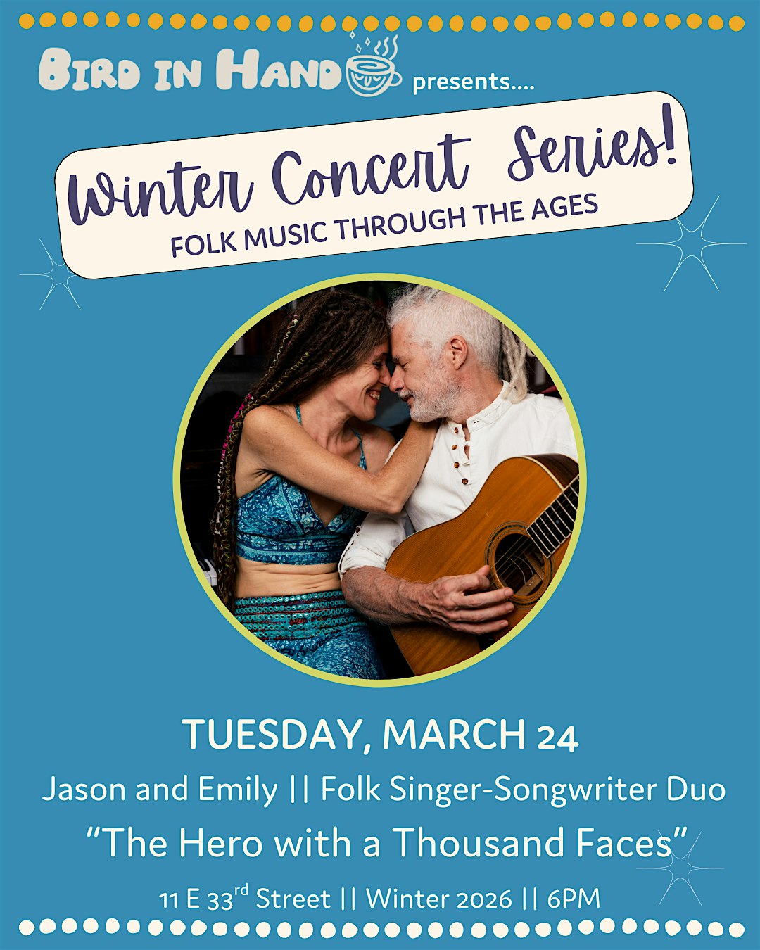 by admin22Feb Bird in Hand presents Jason and Emily: “The Hero with a Thousand Faces” at Bird in Hand Coffee & Books – Baltimore, MD Bird in Hand presents Jason and Emily: “The Hero with a Thousand Faces” at Bird in Hand Coffee & Books – Baltimore, MD 2 2 people viewed this event. Bird in Hand presents Jason and Emily, singer-songwriter duo, in a concert on “The Hero with a Thousand Faces” Tickets-RSVP Link Date And Time Tuesday, March 24th, 2026 @ 10:00 PM Location 11 East 33rd Street, Baltimore, MD 21218 Event Types Concert or PerformancePerforming & Visual Arts Event Category BaltimoreMaryland Share With Friends Facebook Twitter Linkedin Xing Pinterest Share This Post: