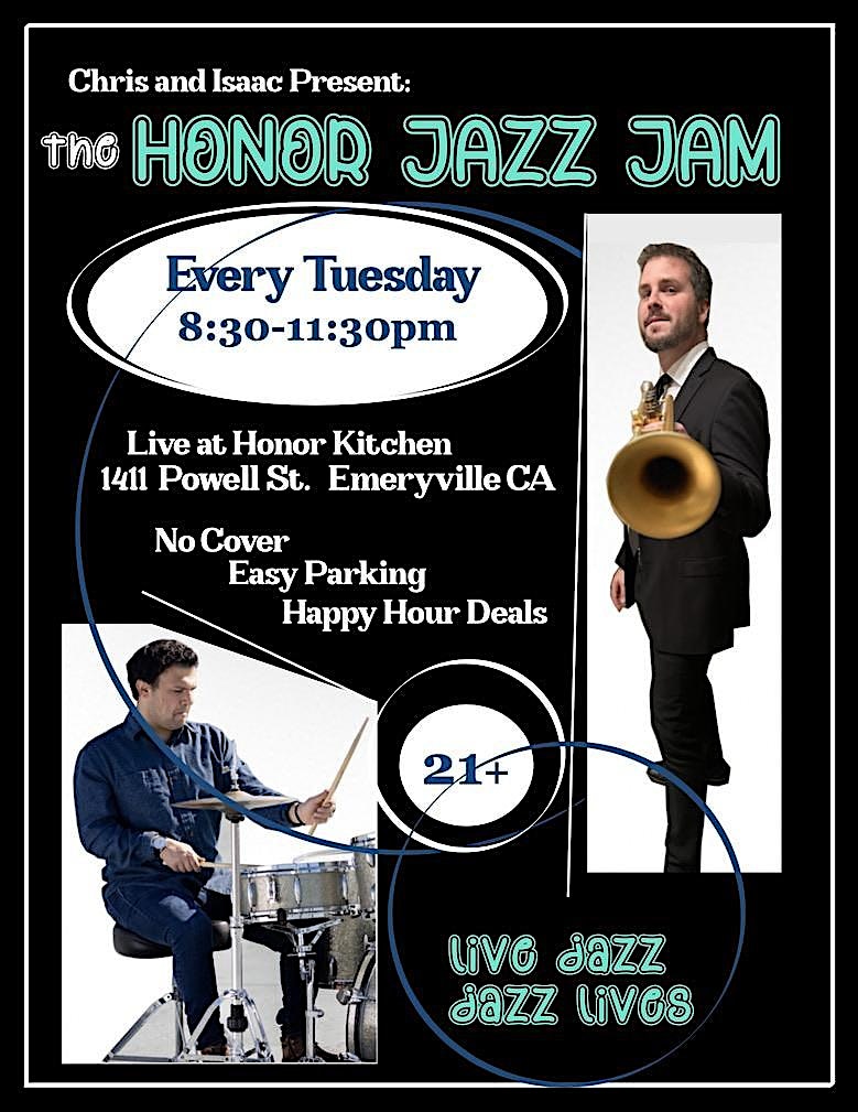 by admin24Feb Honor Jazz Jam at Honor Kitchen – Emeryville, CA Honor Jazz Jam at Honor Kitchen – Emeryville, CA 2 2 people viewed this event. This weekly event features wonderful musicians from the Bay Area collaborating together to create world class jazz. Happy Hour drinks/food. Tickets-RSVP Link Date And Time Tuesday, March 24th, 2026 08:00 PM (PST) Venue Honor Kitchen Location 1411 Powell Street, Emeryville, CA 94608 Event Types Concert or PerformanceMusic Event Category CaliforniaOakland Share With Friends Facebook Twitter Linkedin Xing Pinterest Share This Post: