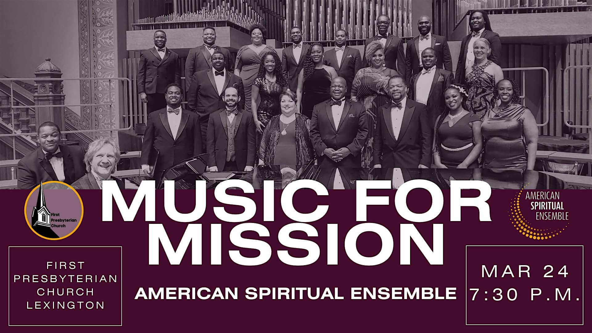 by admin23Feb Music for Mission: The American Spiritual Ensemble at First Presbyterian Church – Lexington, KY Music for Mission: The American Spiritual Ensemble at First Presbyterian Church – Lexington, KY 1 1 people viewed this event. The American Spiritual Ensemble Tickets-RSVP Link Date And Time Tuesday, March 24th, 2026 07:00 PM (PST) Venue First Presbyterian Church Location 171 Market Street, Lexington, KY 40507 Event Types Concert or PerformanceMusic Event Category Kentucky Share With Friends Facebook Twitter Linkedin Xing Pinterest Share This Post:
