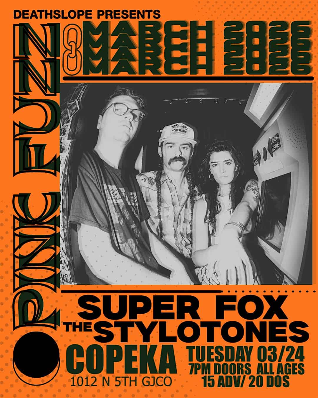 by admin23Feb PINK FUZZ, SUPER FOX, & THE STYLOTONES @ COPEKA at Copeka Coffee – Grand Junction, CO PINK FUZZ, SUPER FOX, & THE STYLOTONES @ COPEKA at Copeka Coffee – Grand Junction, CO 2 2 people viewed this event. All Ages. Doors 7pm. Tickets-RSVP Link Date And Time Tuesday, March 24th, 2026 07:00 PM (PST) Venue Copeka Coffee Location 1012 North 5th Street, Grand Junction, CO 81501 Event Types Concert or PerformanceMusic Event Category Colorado Share With Friends Facebook Twitter Linkedin Xing Pinterest Share This Post: