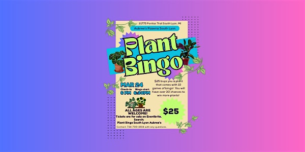 by admin13Feb Plant Bingo South Lyon Aubree’s Pizzeria at Aubree’s Pizzeria & Grill – South Lyon, MI Plant Bingo South Lyon Aubree’s Pizzeria at Aubree’s Pizzeria & Grill – South Lyon, MI 2 2 people viewed this event. Come and enjoy a plant filled night of plants, bingo, pizza, and friends! Tickets-RSVP Link Date And Time Tuesday, March 24th, 2026 10:00 PM (PST) Venue Aubree's Pizzeria & Grill Location 21775 Pontiac Trail, South Lyon, MI 48178 Event Types Food & DrinkParty or Social Gathering Event Category Michigan Share With Friends Facebook Twitter Linkedin Xing Pinterest Share This Post: