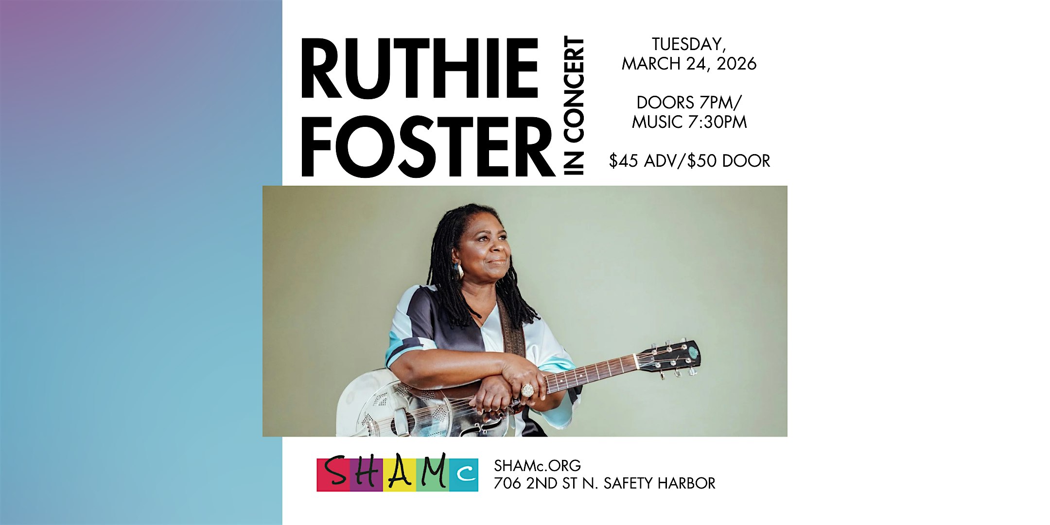 by admin13Feb Ruthie Foster In Concert at Safety Harbor Art And Music Center – Safety Harbor, FL Ruthie Foster In Concert at Safety Harbor Art And Music Center – Safety Harbor, FL 2 2 people viewed this event. See Grammy-winning Blues artist Ruthie Foster on the SHAMc Stage! Tickets-RSVP Link Date And Time Tuesday, March 24th, 2026 11:00 PM (PST) Venue Safety Harbor Art And Music Center Location 706 2nd Street North, Safety Harbor, FL 34695 Event Types Concert or PerformanceMusic Event Category ClearwaterFlorida Share With Friends Facebook Twitter Linkedin Xing Pinterest Share This Post: