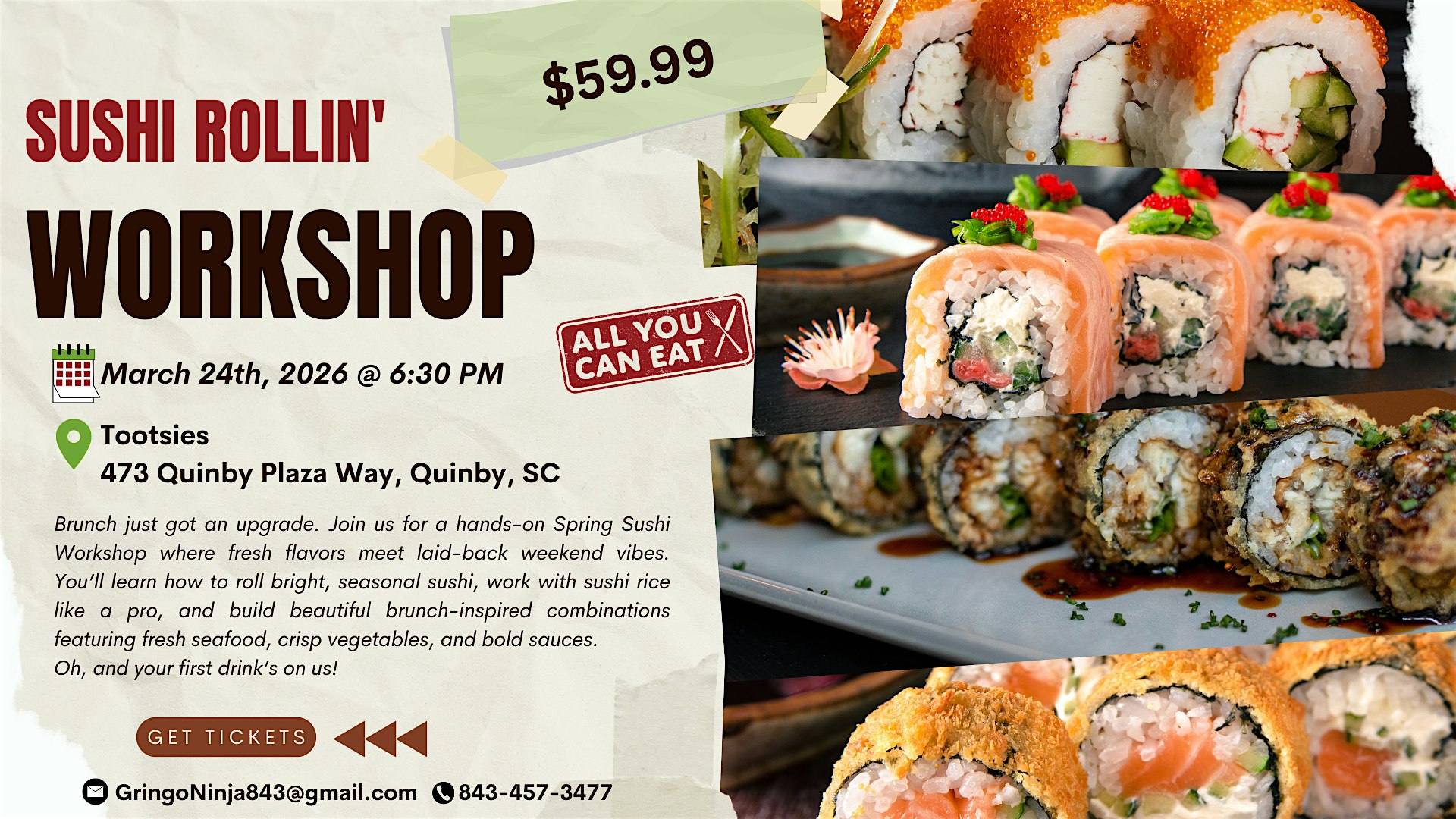 by admin24Feb Sushi Rollin’ 101 at Tootsie’s Everything Waffle – Quinby, SC Sushi Rollin’ 101 at Tootsie’s Everything Waffle – Quinby, SC 2 2 people viewed this event. Take your sushi skills to the next level in this hands-on Sushi Class designed for foodies ready to go beyond the basics. Tickets-RSVP Link Date And Time Tuesday, March 24th, 2026 06:00 PM (PST) Venue Tootsie's Everything Waffle Location 473 Quinby Plaza Way, Quinby, SC 29506 Event Types Food & Drink Event Category South Carolina Share With Friends Facebook Twitter Linkedin Xing Pinterest Share This Post: