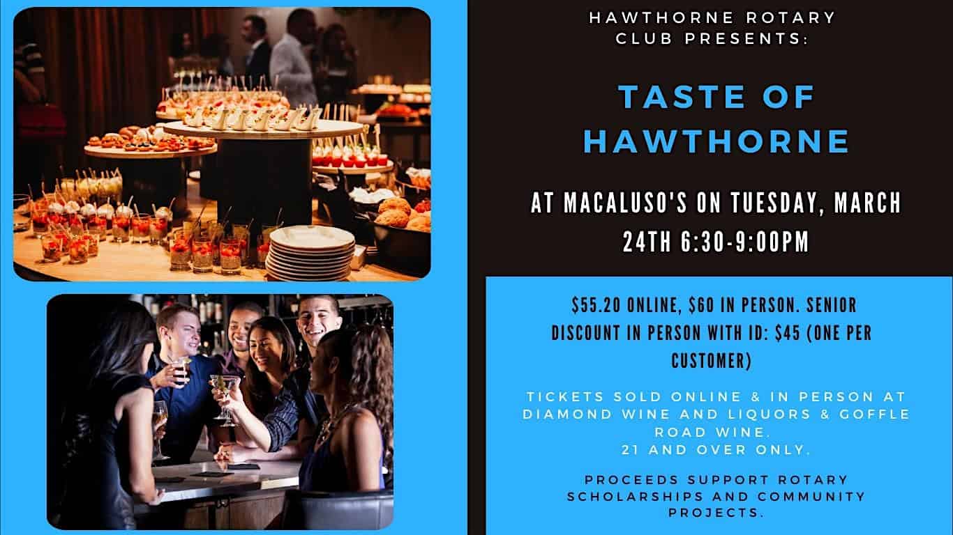 by admin14Feb Taste of Hawthorne at Macaluso’s – Hawthorne, NJ Taste of Hawthorne at Macaluso’s – Hawthorne, NJ 2 2 people viewed this event. Get ready to indulge in a culinary journey through the flavors of Hawthorne, where every bite tells a story worth savoring. Tickets-RSVP Link Date And Time Tuesday, March 24th, 2026 10:00 PM (PST) Venue Macaluso's Location 55 4th Avenue, Hawthorne, NJ 7506 Event Types Festival or FairFood & Drink Event Category New Jersey Share With Friends Facebook Twitter Linkedin Xing Pinterest Share This Post:
