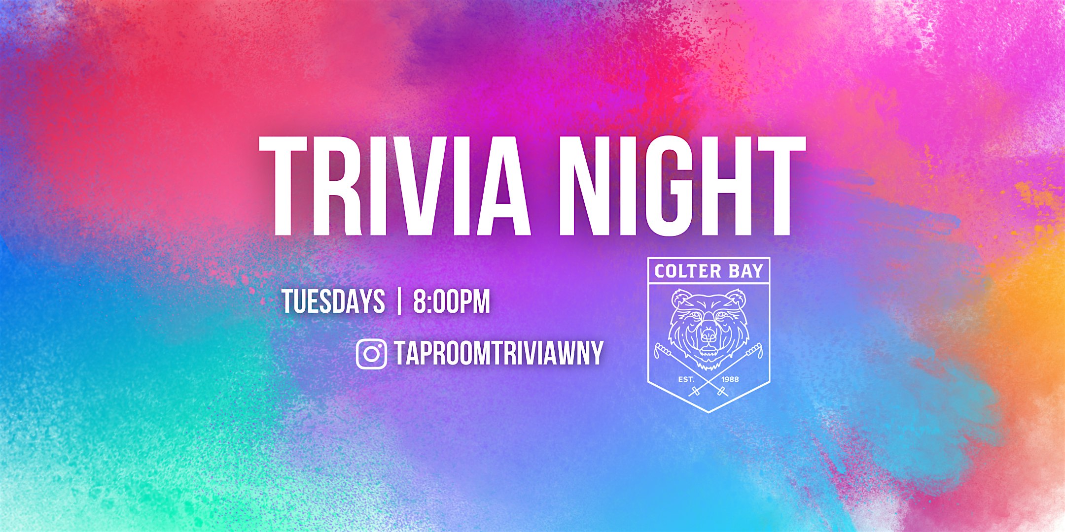Trivia Tuesdays at Colter Bay at Colter Bay – Buffalo, NY Trivia Tuesdays at Colter Bay at Colter Bay – Buffalo, NY 1 1 people viewed this event. Join us every Wednesday at 8:00 | Free to play | Reservations: 716-436-5197 | Follow us on IG: @TaproomTriviaWNY Tickets-RSVP Link Register for event Date And Time Tuesday, March 24th, 2026 @ 08:00 PM Location 561 Delaware Avenue, Buffalo, NY 14202 Event Types Food & DrinkGame or Competition Event Category BuffaloNew York Share With Friends Facebook Twitter Linkedin Xing Pinterest
