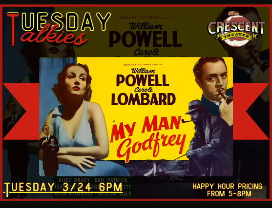 Tickets are $10 at the Door. Happy Hour Pricing from 5-8pmMy Man Godfrey is a 1936 screwball comedy directed by Gregory La Cava and starring William Powell and Carole Lombard.Set during the Great Depression, the story begins when socialite Irene Bullock (Lombard) scavenges a city dump on a whim as part of a frivolous society treasure hunt, where wealthy partygoers compete to bring a forgotten man back to their gala. She encounters Godfrey (Powell), a witty and dignified homeless man who reluctantly agrees to attend the eventwhere he cleverly exposes the hypocrisy and cruelty of the elite guests.Impressed and slightly infatuated, Irene persuades her eccentric family to hire Godfrey as their butler. As he takes charge of the chaotic Bullock householdcalming Irenes scatterbrained mother, outmaneuvering her scheming sister, and quietly managing the familys financial and social blundersGodfrey reveals himself to be far more intelligent and capable than anyone expects.Over time, it becomes clear that Godfrey is not who he seems, and his mysterious past reshapes the familys fortunes while challenging their shallow values. Mixing sharp social satire with romantic comedy, My Man Godfrey remains one of the defining screwball comedies of the 1930s, praised for its biting critique of wealth and its sparkling performances.