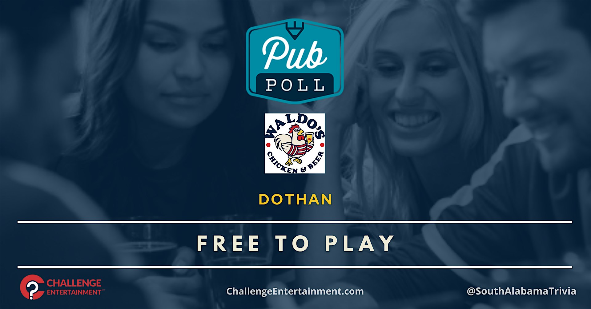 Weekly Pub Poll Game Nights at Waldo’s Chicken & Beer – Dothan at Waldo’s Chicken & Beer – Dothan, AL Weekly Pub Poll Game Nights at Waldo’s Chicken & Beer – Dothan at Waldo’s Chicken & Beer – Dothan, AL 1 1 people viewed this event. Weekly Pub Poll Game Nights at Waldo’s Chicken & Beer – Dothan Tickets-RSVP Link Register for event Date And Time Tuesday, March 24th, 2026 @ 06:00 PM Location 4700 West Main Street, Dothan, ALĀ 36305 Event Types Food & DrinkGame or Competition Event Category Alabama Share With Friends Facebook Twitter Linkedin Xing Pinterest