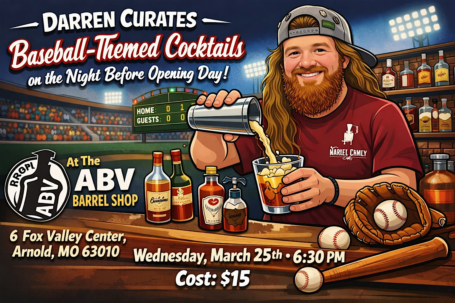by admin27Feb ABV Barrel Shop Darren McRoy Baseball-Themed Cocktail Class at ABV Barrel Shop – Arnold, MO ABV Barrel Shop Darren McRoy Baseball-Themed Cocktail Class at ABV Barrel Shop – Arnold, MO 1 1 people viewed this event. On the eve of the baseball season opener, Darren hosts a cocktail class where he makes baseball-themed cocktails. Tickets-RSVP Link Date And Time Wednesday, March 25th, 2026 06:00 PM (PST) Venue ABV Barrel Shop Location 6 Fox Valley Center, Arnold, MO 63010 Event Types Food & Drink Event Category Missouri Share With Friends Facebook Twitter Linkedin Xing Pinterest Share This Post: