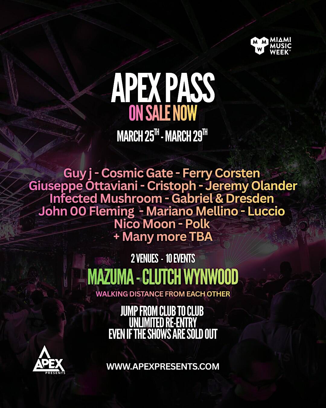 by admin23Feb APEX 2026 MMW PASS at Clutch Wynwood – Miami, FL APEX 2026 MMW PASS at Clutch Wynwood – Miami, FL 2 2 people viewed this event. ACCESS TO ALL SHOWS (15 SHOWS) EVEN IF SHOWS ARE SOLD OUT RE-ENTRY TO ALL SHOWS PASS IS NOT TRANSFERABLE – ( Pass must match Buyers ID ) Tickets-RSVP Link Date And Time Wednesday, March 25th, 2026 09:00 PM (PST) Venue Clutch Wynwood Location 2250 NW 2nd Ave, Miami, FL 33127 Event Types Concert or PerformanceMusic Event Category FloridaMiami Share With Friends Facebook Twitter Linkedin Xing Pinterest Share This Post: