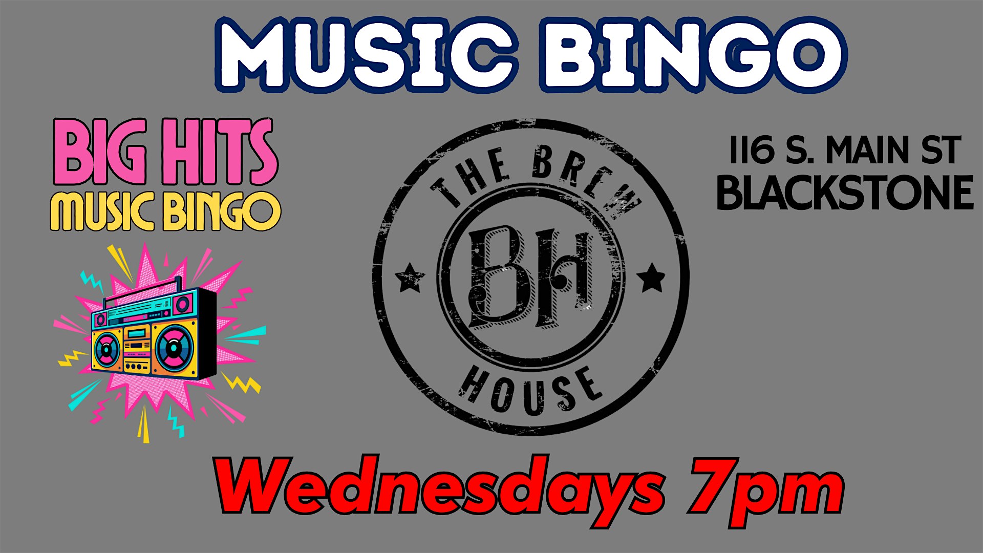 Big Hits Music Bingo Wednesdays at The Brew House Blackstone at The Brew House – Blackstone, VA Big Hits Music Bingo Wednesdays at The Brew House Blackstone at The Brew House – Blackstone, VA 2 2 people viewed this event. Wednesdays at The Brew House in Blackstone are for BIG MUSIC FUN Tickets-RSVP Link Register for event Date And Time Wednesday, March 25th, 2026 @ 07:00 PM Location 116 South Main Street, Blackstone, VA 23824 Event Types Game or CompetitionMusic Event Category Virginia Share With Friends Facebook Twitter Linkedin Xing Pinterest