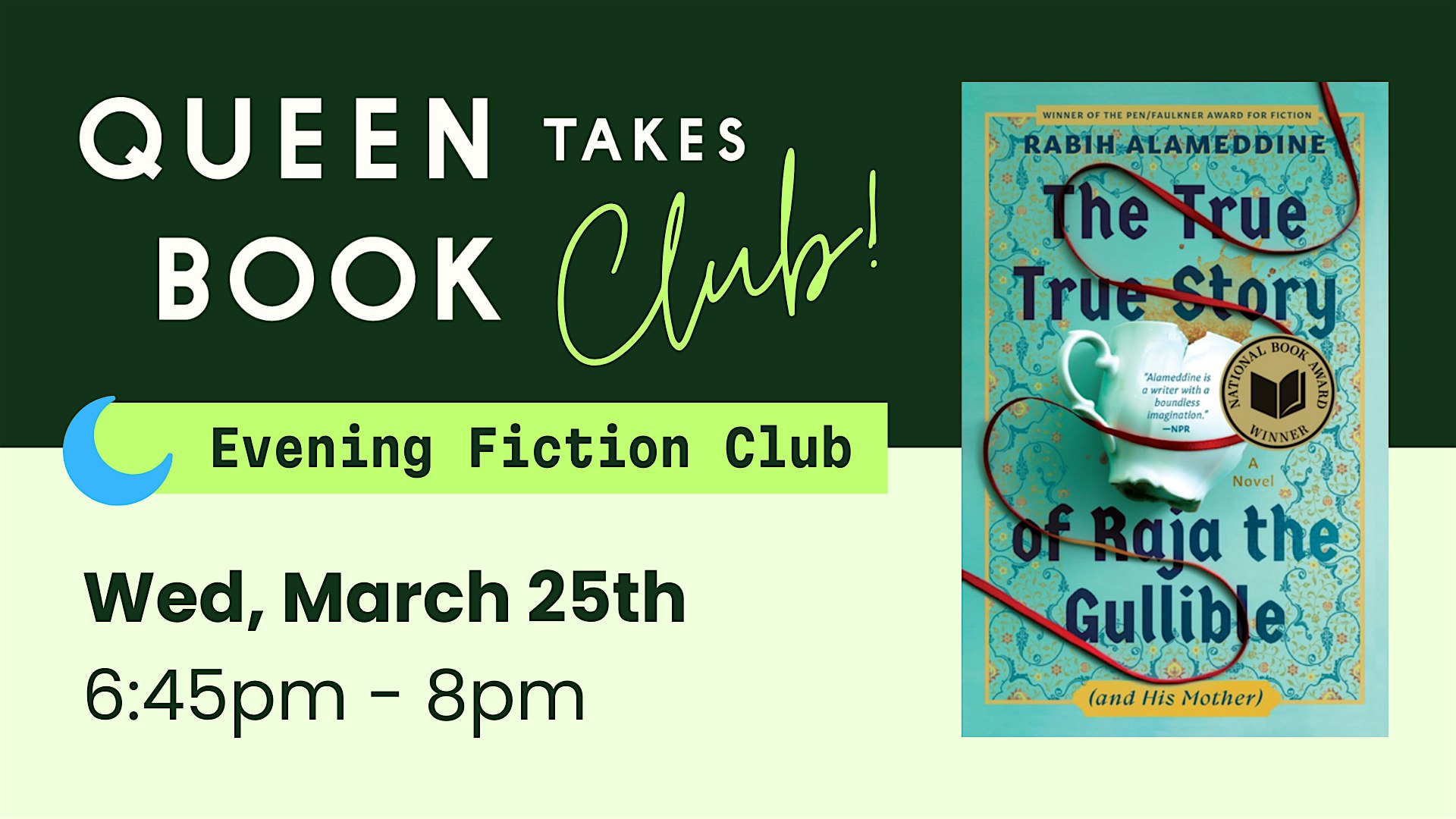 by admin13Feb Evening Fiction Club – March ’26 at Queen Takes Book – Columbia, MD Evening Fiction Club – March ’26 at Queen Takes Book – Columbia, MD 2 2 people viewed this event. Join us on Wed, Mar 25th at 6:45pm. This month we’ll be reading “The True True Story of Raja the Gullible (and His Mother)”. Tickets-RSVP Link Date And Time Wednesday, March 25th, 2026 10:00 PM (PST) Venue Queen Takes Book Location 6955 Oakland Mills Road, Columbia, MD 21045 Event Types Party or Social Gathering Event Category BaltimoreMaryland Share With Friends Facebook Twitter Linkedin Xing Pinterest Share This Post: