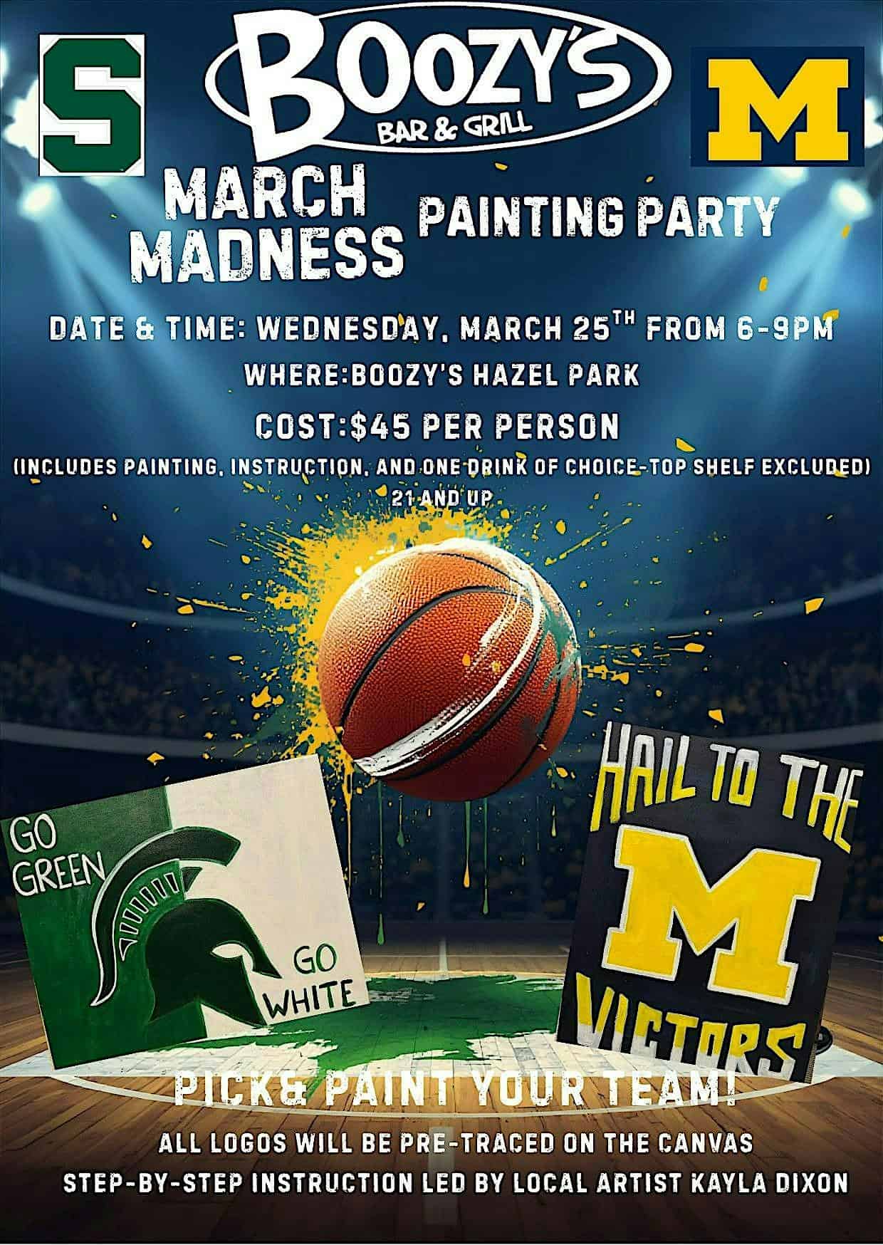 by admin23Feb March Madness Painting Party at Boozy’s at Boozy’s Bar & Grill – Hazel Park, MI March Madness Painting Party at Boozy’s at Boozy’s Bar & Grill – Hazel Park, MI 2 2 people viewed this event. Join us at Boozy’s for a fun March Madness Painting Party—sip, paint, and cheer on your favorite teams! Tickets-RSVP Link Date And Time Wednesday, March 25th, 2026 06:00 PM (PST) Venue Boozy’s Bar & Grill Location 21504 John R Road, Hazel Park, MI 48030 Event Types Food & DrinkParty or Social Gathering Event Category Michigan Share With Friends Facebook Twitter Linkedin Xing Pinterest Share This Post: