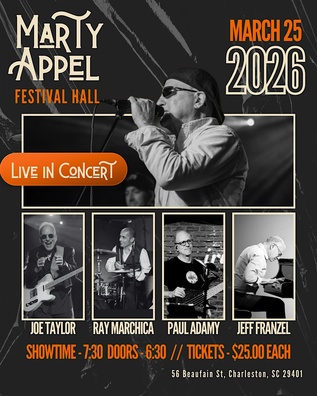 by admin13Feb Marty Appel Live in Concert at Festival Hall – Charleston, SC Marty Appel Live in Concert at Festival Hall – Charleston, SC 2 2 people viewed this event. Get ready to rock with Marty Appel Live in Concert—an epic night of music and fun you won’t wanna miss! Tickets-RSVP Link Date And Time Wednesday, March 25th, 2026 11:00 PM (PST) Venue Festival Hall Location 56 Beaufain Street, Charleston, SC 29401 Event Types Concert or PerformanceMusic Event Category CharlestonSouth Carolina Share With Friends Facebook Twitter Linkedin Xing Pinterest Share This Post: