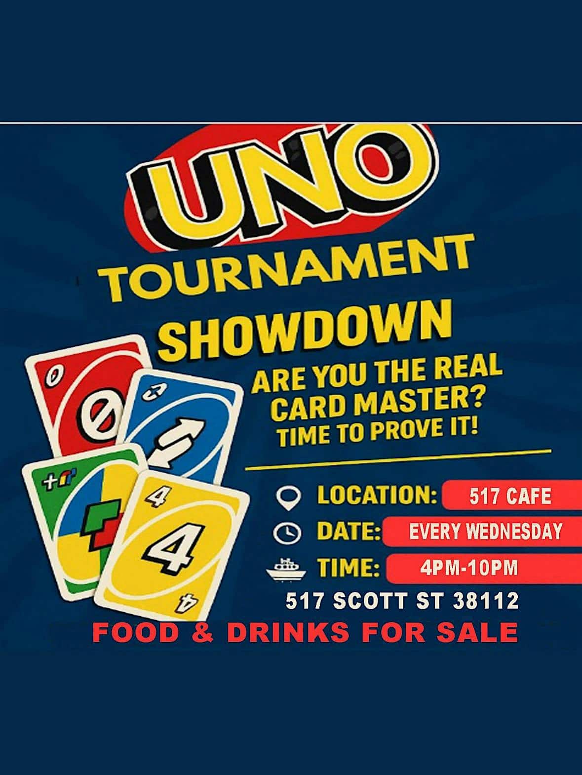 by admin24Feb Memphis Uno Night at 517 Scott St – Memphis, TN Memphis Uno Night at 517 Scott St – Memphis, TN 4 4 people viewed this event. starting Oct 1st‼️ 4pm-10pm EVERYDAY 517 Cafe’ Board/Card Games Italian Ice , Deep Fried Oreos Grilled Hot Dogs , Nachos Gps 517 Scott Tickets-RSVP Link Date And Time Wednesday, March 25th, 2026 04:00 PM (PST) Venue 517 Scott St Location 517 Scott Street, Memphis, TN 38112 Event Types Food & Drink Event Category MemphisTennessee Share With Friends Facebook Twitter Linkedin Xing Pinterest Share This Post: