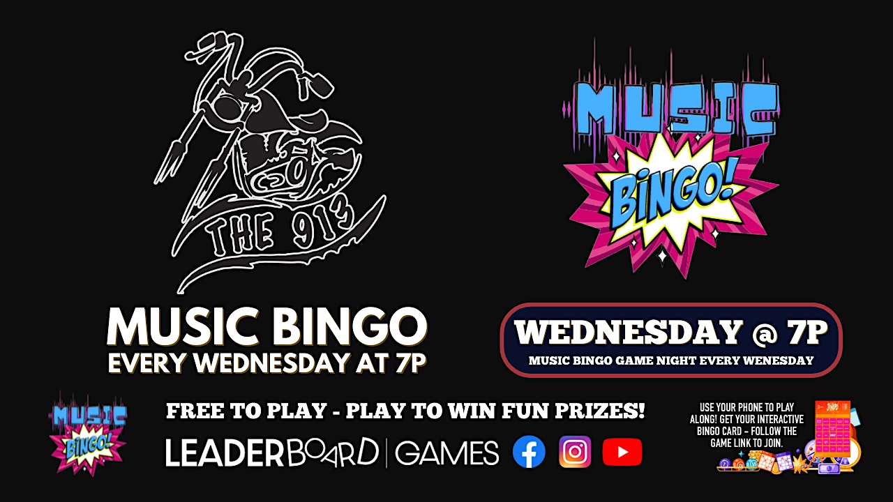 Music BINGO WEDNESDAY 7p | The 913 – Kansas City KS @LeaderboardGames at The 913 – Kansas City, KS Music BINGO WEDNESDAY 7p | The 913 – Kansas City KS @LeaderboardGames at The 913 – Kansas City, KS 2 2 people viewed this event. The 913 – Kansas City KS hosts Music BINGO Game Night WEDNESDAYS at 7p – Great music, fun and PRIZES! FREE to Play! Tickets-RSVP Link Register for event Date And Time Wednesday, March 25th, 2026 @ 07:00 PM Location 6102 State Avenue, Kansas City, KS 66102 Event Types Game or CompetitionMusic Event Category Kansas Share With Friends Facebook Twitter Linkedin Xing Pinterest
