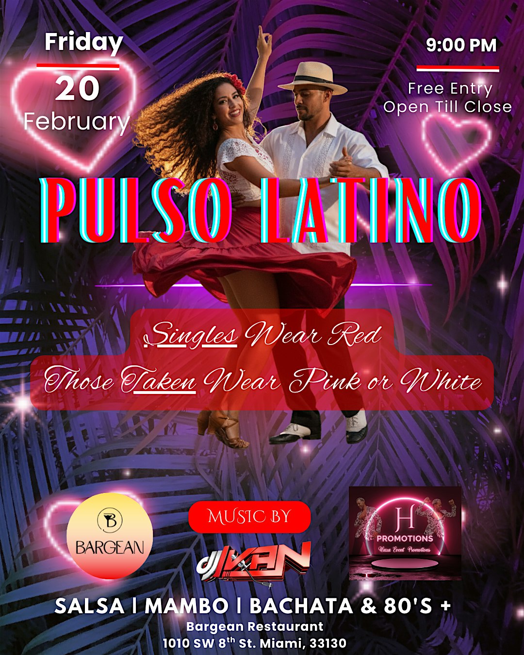 by admin27Feb Pulso Latino’s Valentine Dance Party at Bargean Miami – Miami, FL Pulso Latino’s Valentine Dance Party at Bargean Miami – Miami, FL 2 2 people viewed this event. Valentine’s at Pulso Latino Dance Night! ❤️ Enjoy free entry, Salsa, Bachata, and more—plus food and drink specials all night. Tickets-RSVP Link Date And Time Wednesday, March 25th, 2026 @ 10:00 AM Location 1010 Southwest 8th Street, Miami, FL 33130 Event Types Community & CultureParty or Social Gathering Event Category FloridaMiami Share With Friends Facebook Twitter Linkedin Xing Pinterest Share This Post: