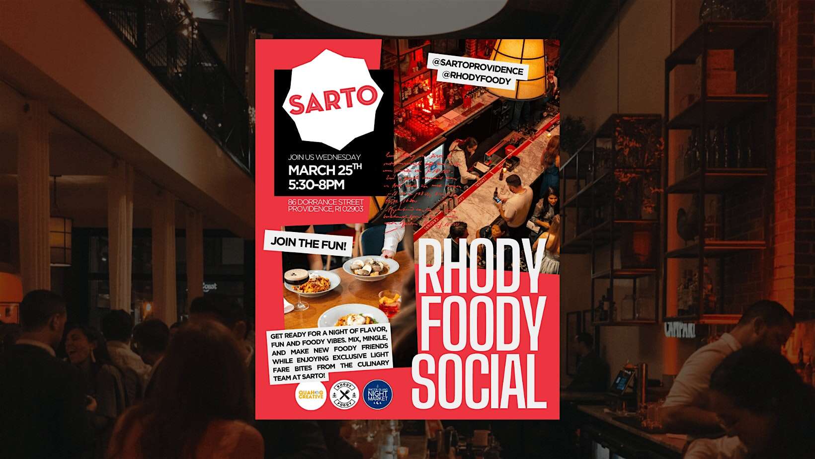 by admin23Feb Rhody Foody Social x Sarto at Sarto Restaurant – Providence, RI Rhody Foody Social x Sarto at Sarto Restaurant – Providence, RI 4 4 people viewed this event. Mix, mingle, and make new foody friends while enjoying exclusive light fare bites from the culinary team at Sarto Providence! Tickets-RSVP Link Date And Time Wednesday, March 25th, 2026 05:00 PM (PST) Venue Sarto Restaurant Location 86 Dorrance Street, Providence, RI 2903 Event Types Food & DrinkParty or Social Gathering Event Category ProvidenceRhode Island Share With Friends Facebook Twitter Linkedin Xing Pinterest Share This Post: