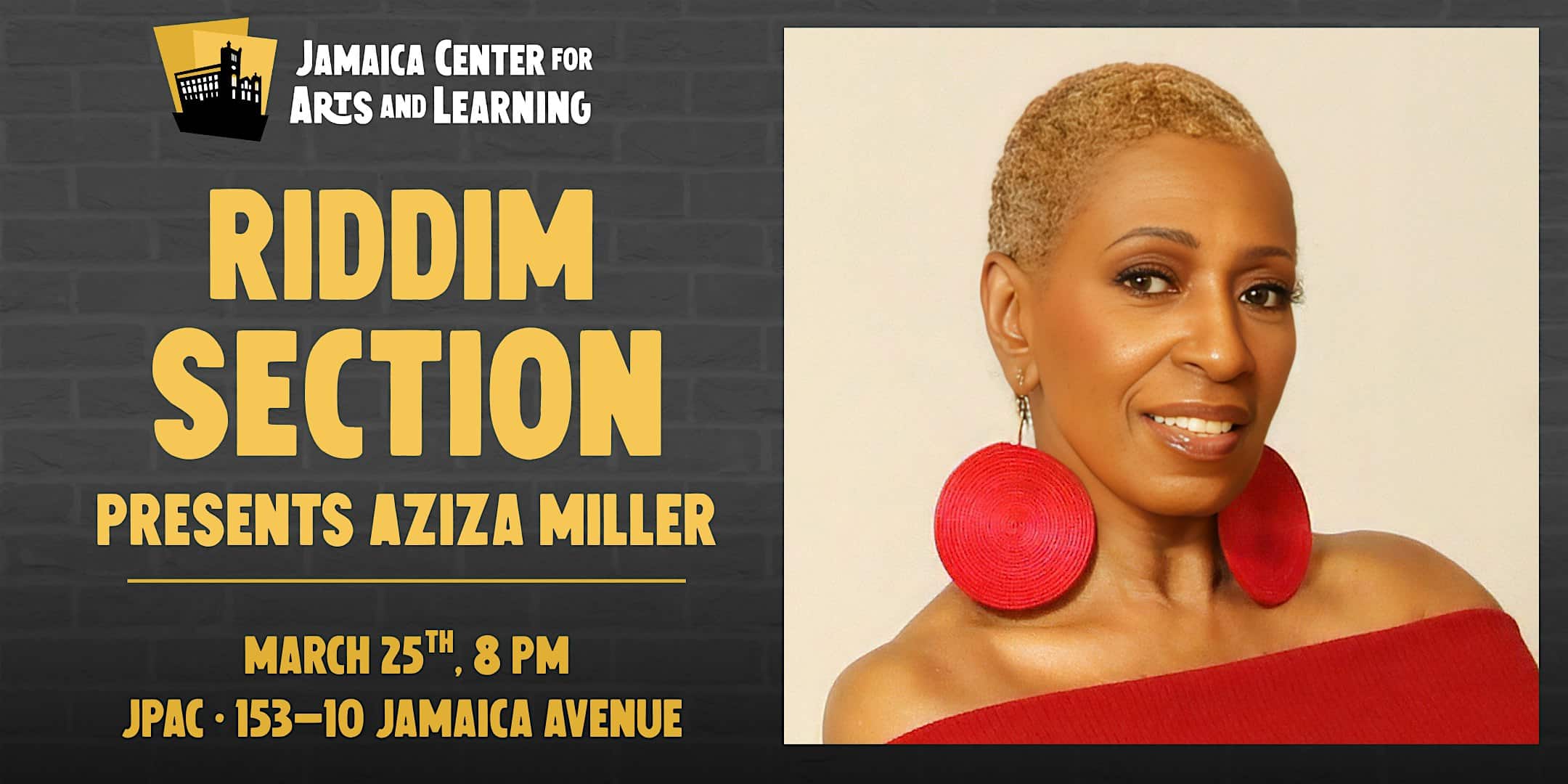 by admin23Feb Riddim Section Presents Aziza Miller at Jamaica Performing Arts Center – Jamaica, NY Riddim Section Presents Aziza Miller at Jamaica Performing Arts Center – Jamaica, NY 2 2 people viewed this event. JCAL’s music series continues with a highly anticipated concert! Tickets-RSVP Link Date And Time Wednesday, March 25th, 2026 08:00 PM (PST) Venue Jamaica Performing Arts Center Location 153-10 Jamaica Avenue, Jamaica, NY 11432 Event Types Concert or PerformanceMusic Event Category New YorkNew York City Share With Friends Facebook Twitter Linkedin Xing Pinterest Share This Post: