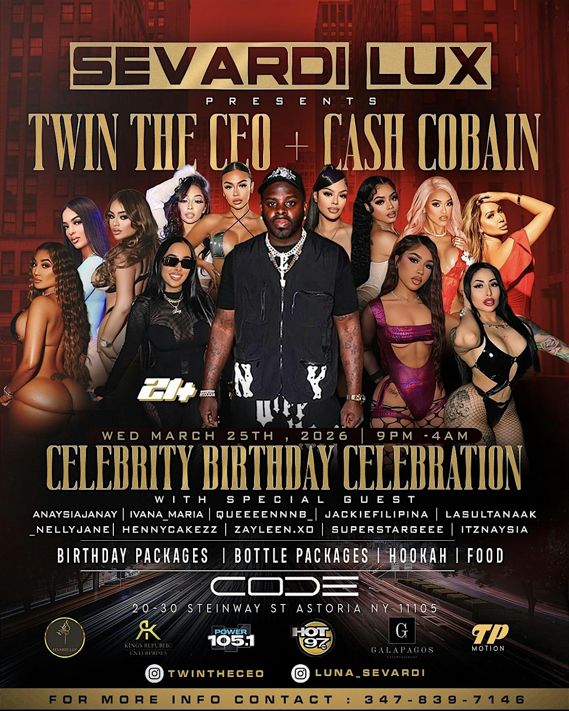 by admin13Feb SEVARDI LUX+TWIN THE CEO+CASH COBAIN+SLAY BY ELLA+ STAR BUTE+ DON Q BASH at Code Astoria – Queens, NY SEVARDI LUX+TWIN THE CEO+CASH COBAIN+SLAY BY ELLA+ STAR BUTE+ DON Q BASH at Code Astoria – Queens, NY 3 3 people viewed this event. DJ SELF+ DJ DREWSKI+DJ BLUE DIAMOND+ DJ NORIE+DJ YOUNG CHOW+ DJ FIRST CHOICE+ DJ HOTROD Tickets-RSVP Link Date And Time Wednesday, March 25th, 2026 09:00 PM (PST) Venue Code Astoria Location 20-30 Steinway Street, Queens, NY 11105 Event Types MusicParty or Social Gathering Event Category New YorkNew York City Share With Friends Facebook Twitter Linkedin Xing Pinterest Share This Post: