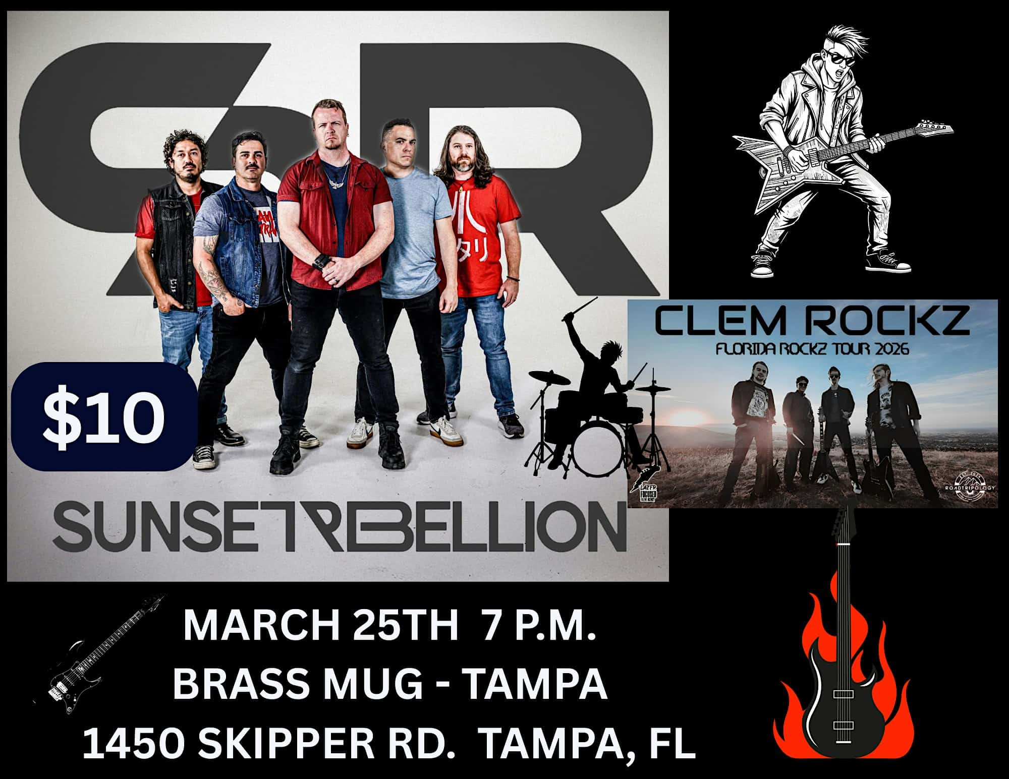 by admin14Feb SUNSET REBELLION AND CLEM ROCKZ ROCK THE BRASS MUG at Brass Mug – Tampa, FL SUNSET REBELLION AND CLEM ROCKZ ROCK THE BRASS MUG at Brass Mug – Tampa, FL 2 2 people viewed this event. Get ready to vibe live as Sunset Rebellion and Clem Rockz light up The Brass Mug with killer tunes! Tickets-RSVP Link Date And Time Wednesday, March 25th, 2026 11:00 PM (PST) Venue Brass Mug Location 1450 Skipper Road, Tampa, FL 33613 Event Types Concert or PerformanceMusic Event Category FloridaTampa Share With Friends Facebook Twitter Linkedin Xing Pinterest Share This Post: