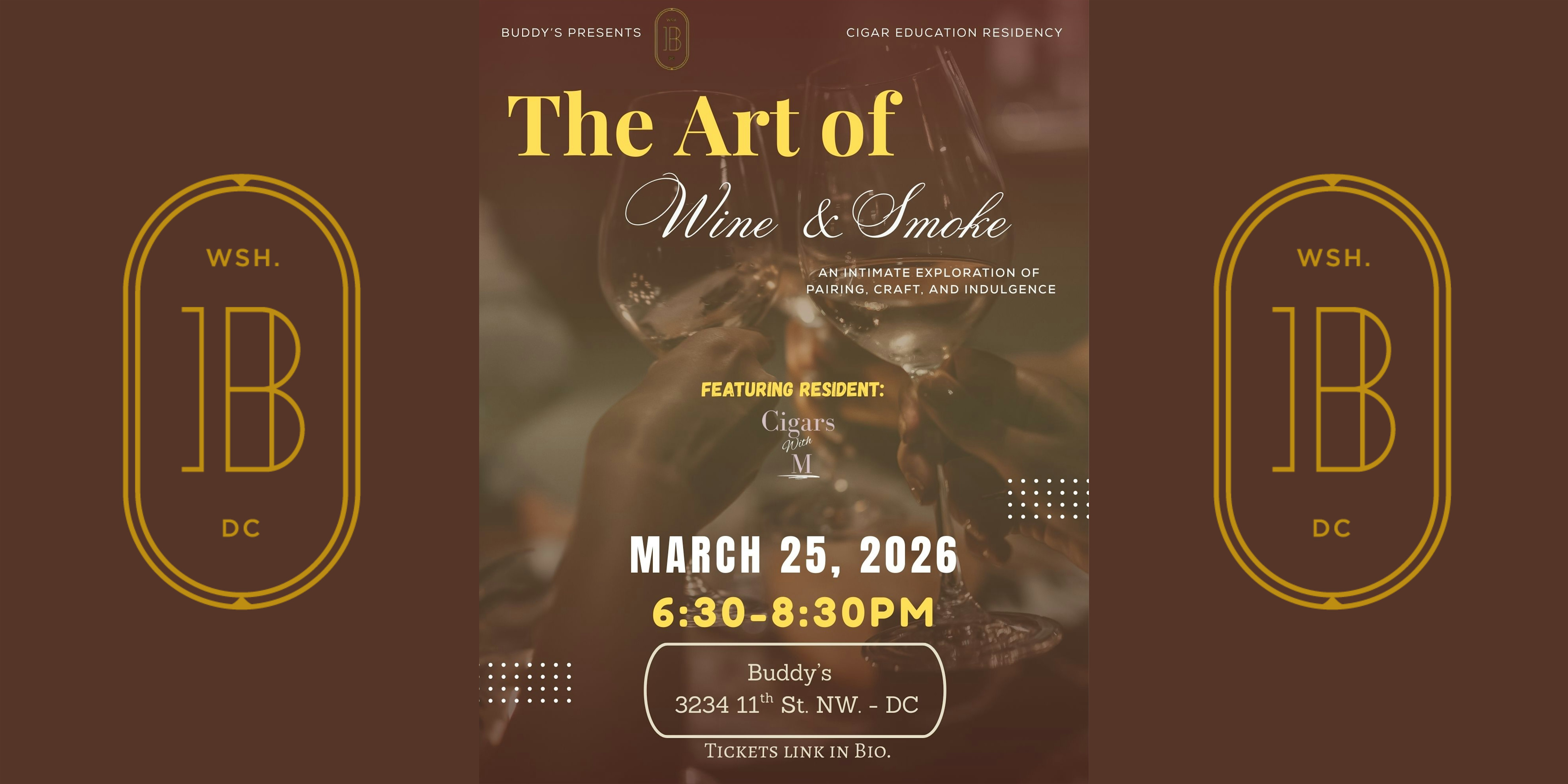 The Art of Wine & Smoke: Cigar Education Class at BUDDY’S DC – Washington, DC The Art of Wine & Smoke: Cigar Education Class at BUDDY’S DC – Washington, DC 2 2 people viewed this event. Join us for a chill night of sipping fine wines and learning the secrets to perfect cigar smoking! Tickets-RSVP Link Register for event Date And Time Wednesday, March 25th, 2026 @ 06:00 PM Location 3234 11th Street Northwest, Washington, DC 20010 Event Types Class, Training, or WorkshopFood & Drink Event Category Washington DC Share With Friends Facebook Twitter Linkedin Xing Pinterest