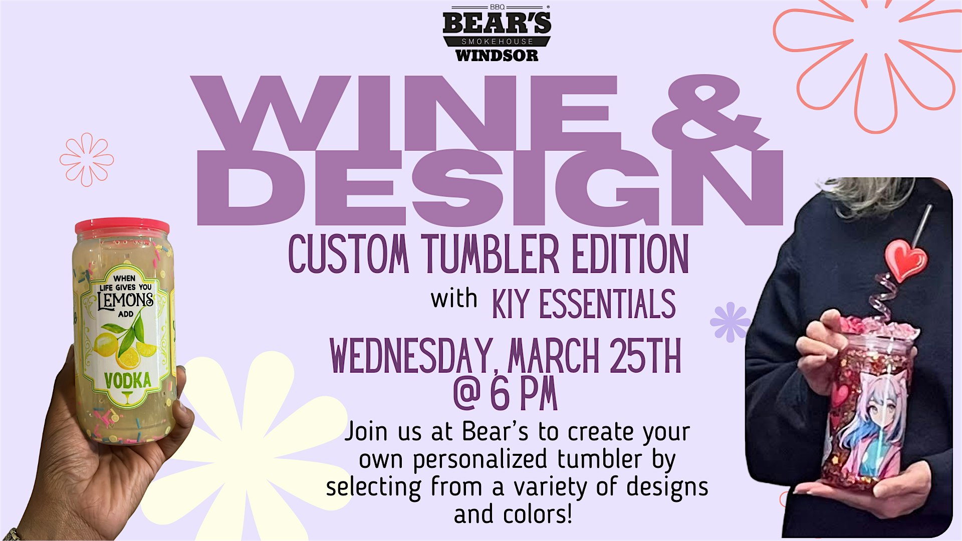 Wine & Design – Custom Tumblers Class at Bear’s Smokehouse Barbecue – Windsor, CT Wine & Design – Custom Tumblers Class at Bear’s Smokehouse Barbecue – Windsor, CT 2 2 people viewed this event. Join us at Bear’s BBQ Windsor for a fun night crafting your own custom tumblers with KIY Essentials! Tickets-RSVP Link Register for event Date And Time Wednesday, March 25th, 2026 @ 06:00 PM Location 2152 Poquonock Avenue, Windsor, CTÂ 6095 Event Types Class, Training, or WorkshopFood & Drink Event Category Connecticut Share With Friends Facebook Twitter Linkedin Xing Pinterest