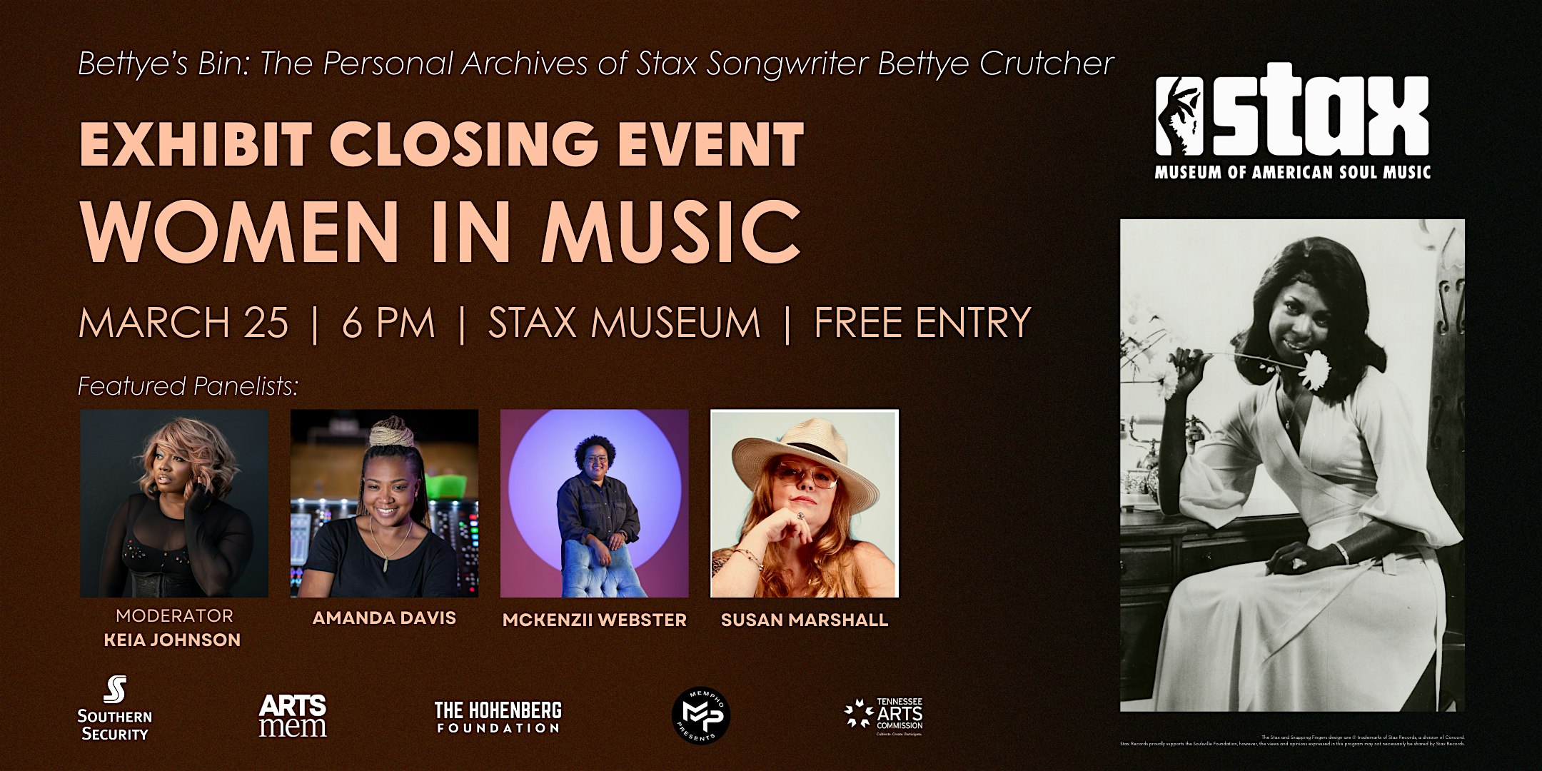 Women in Music Networking Night: Honoring Bettye Crutcher at Stax Museum of American Soul Music – Memphis, TN Women in Music Networking Night: Honoring Bettye Crutcher at Stax Museum of American Soul Music – Memphis, TN 2 2 people viewed this event. Celebrate the closing of Stax Museum’s Bettye Crutcher Exhibit with a networking night for women in Memphis music Tickets-RSVP Link Register for event Date And Time Wednesday, March 25th, 2026 @ 06:00 PM Location 926 East McLemore Avenue, Memphis, TN 38106 Event Types Meeting or Networking EventMusic Event Category MemphisTennessee Share With Friends Facebook Twitter Linkedin Xing Pinterest