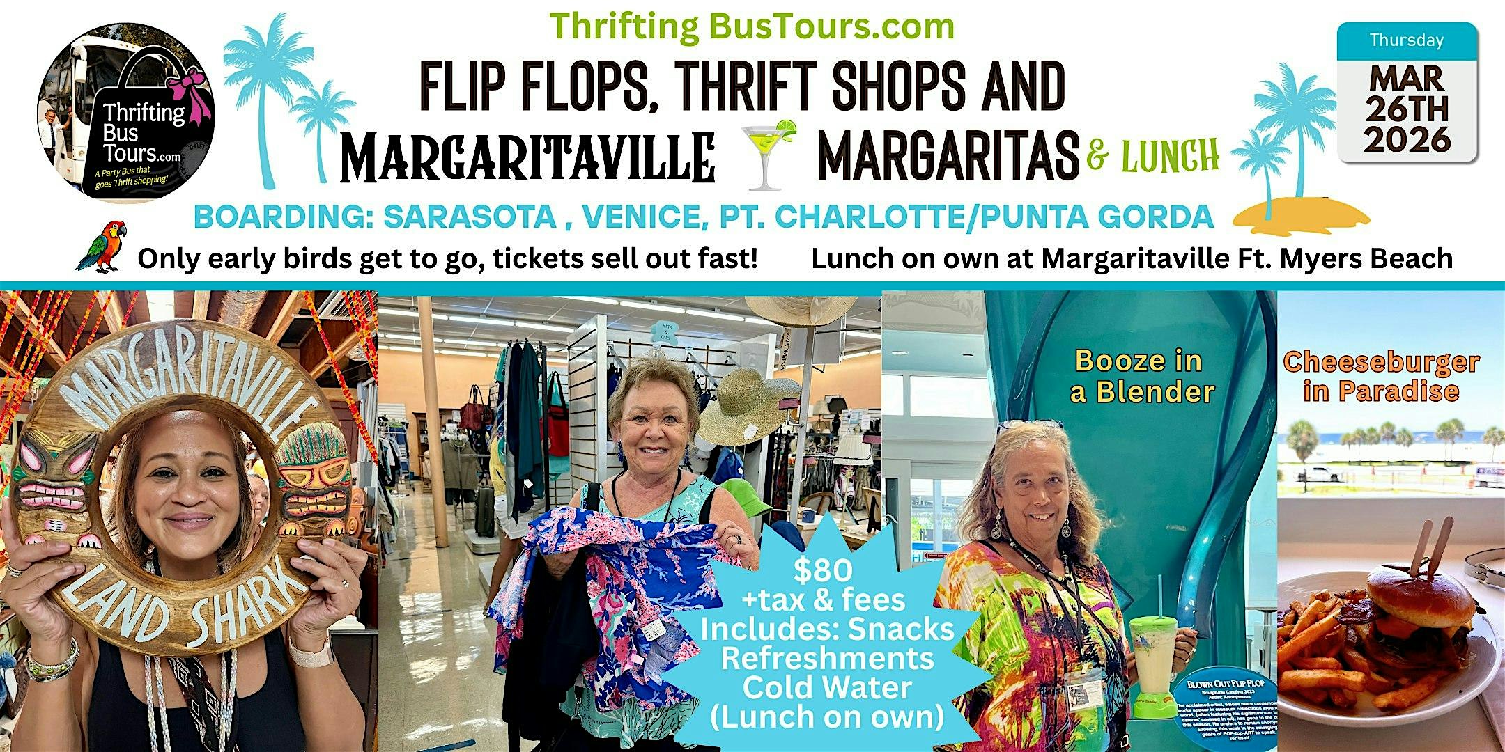 3/26 Flip Flops, Thrift Shops & Margaritaville Bus Board Sara Ven PtC/PG at 3 BOARDING LOCATIONS: #1 SARASOTA/BRADENTON #2 VENICE #3 PT. CHARLOTTE/PUNTA GORDA – Sarasota, FL