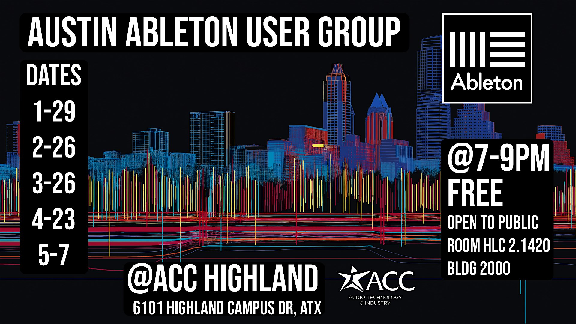 by admin27Feb Austin Ableton User Group Meetup – Mar.26 at 6101 Highland Campus Dr – Austin, TX Austin Ableton User Group Meetup – Mar.26 at 6101 Highland Campus Dr – Austin, TX 1 1 people viewed this event. Join us for community discussions and demos of production topics and workflows. Welcome to all experience levels and types of producers. Tickets-RSVP Link Date And Time Thursday, March 26th, 2026 07:00 PM (PST) Venue 6101 Highland Campus Dr Location 6101 Highland Campus Drive, Austin, TX 78752 Event Types Music Event Category AustinTexas Share With Friends Facebook Twitter Linkedin Xing Pinterest Share This Post: