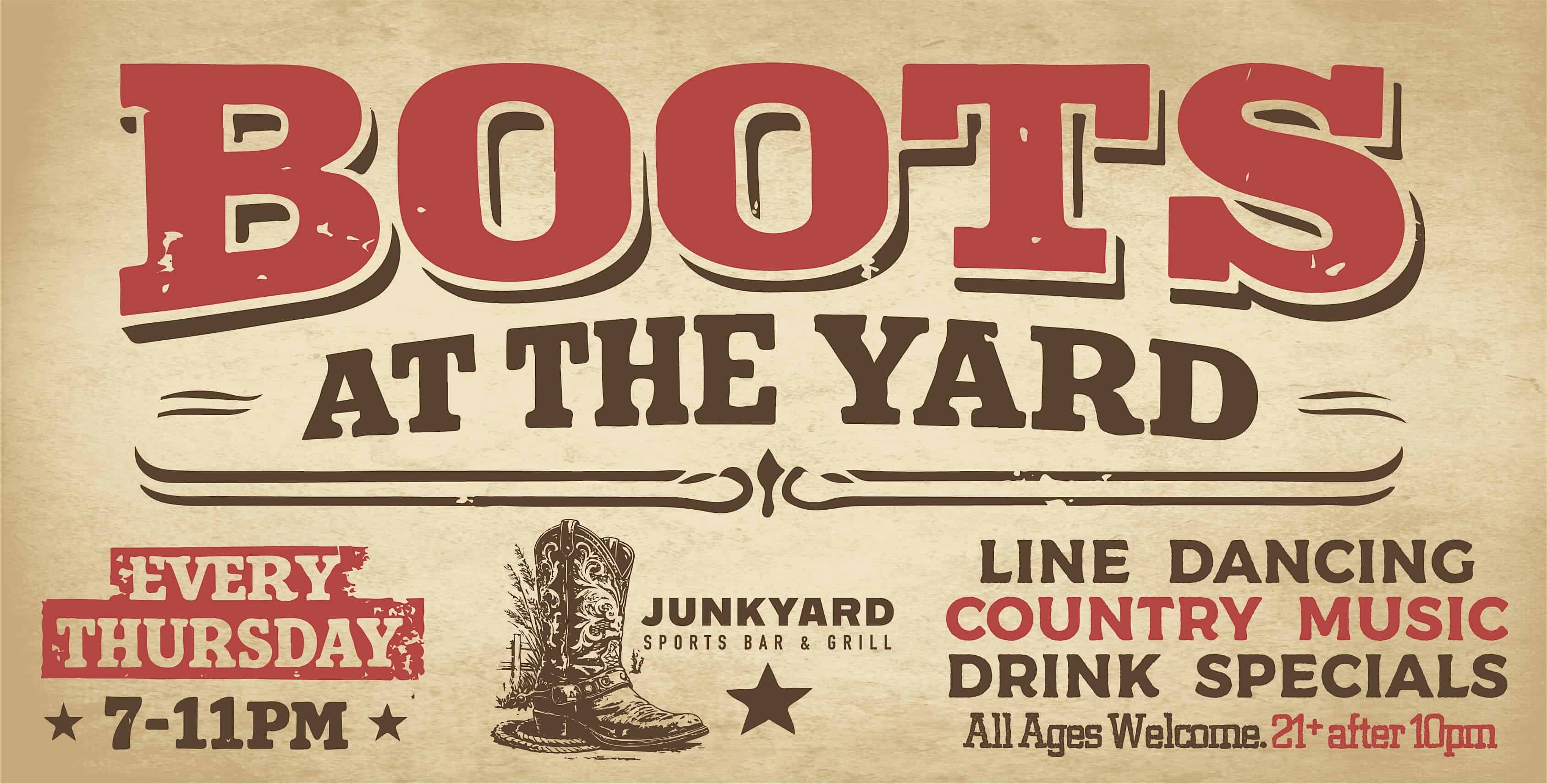 by admin23Feb Boots at the Yard at Junkyard Sports Bar & Grill – Oceanside, CA Boots at the Yard at Junkyard Sports Bar & Grill – Oceanside, CA 2 2 people viewed this event. Country Night at Junkyard Sports Bar & Grill featuring line dancing with an instructor and a country DJ playing all your Honky Tonk hits. Tickets-RSVP Link Date And Time Thursday, March 26th, 2026 07:00 PM (PST) Venue Junkyard Sports Bar & Grill Location 3617 Ocean Ranch Boulevard, Oceanside, CA 92056 Event Types MusicParty or Social Gathering Event Category California Share With Friends Facebook Twitter Linkedin Xing Pinterest Share This Post: