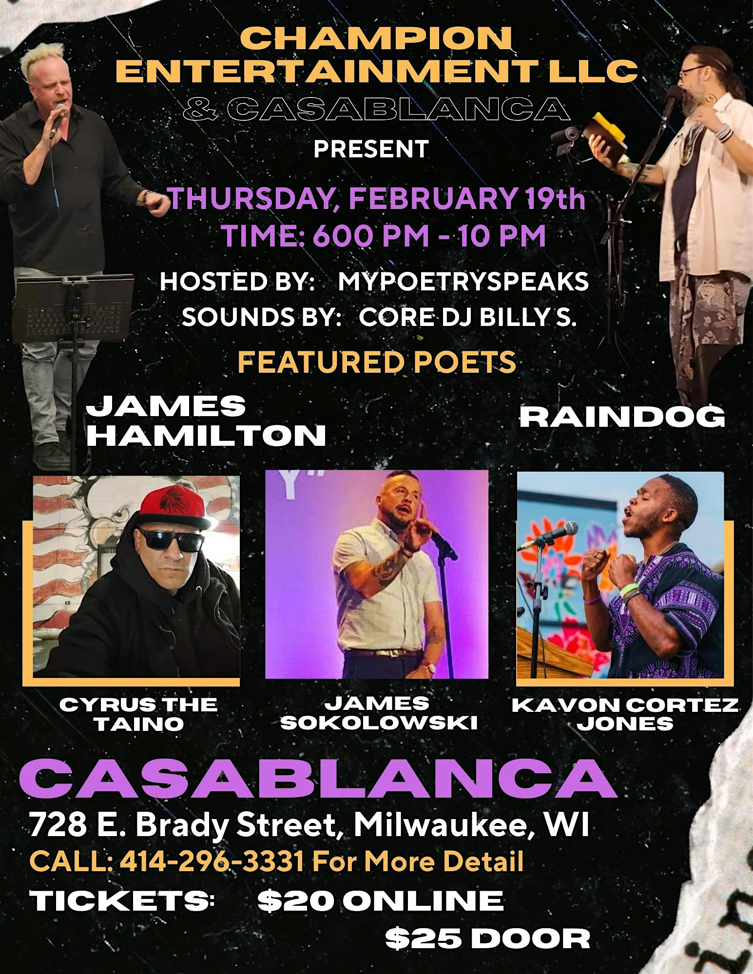 by admin24Feb CITY LIGHTS OPEN MIC at 728 E Brady St – Milwaukee, WI CITY LIGHTS OPEN MIC at 728 E Brady St – Milwaukee, WI 3 3 people viewed this event. Enjoy this week’s heavy weights features JAMES HAMILTON, KAVON CORTEZ JONES, RAINDOG AND CYRUS THE TAINO Tickets-RSVP Link Date And Time Thursday, March 26th, 2026 06:00 PM (PST) Venue 728 E Brady St Location 728 East Brady Street, Milwaukee, WI 53202 Event Types Concert or PerformanceMusic Event Category MilwaukeeWisconsin Share With Friends Facebook Twitter Linkedin Xing Pinterest Share This Post: