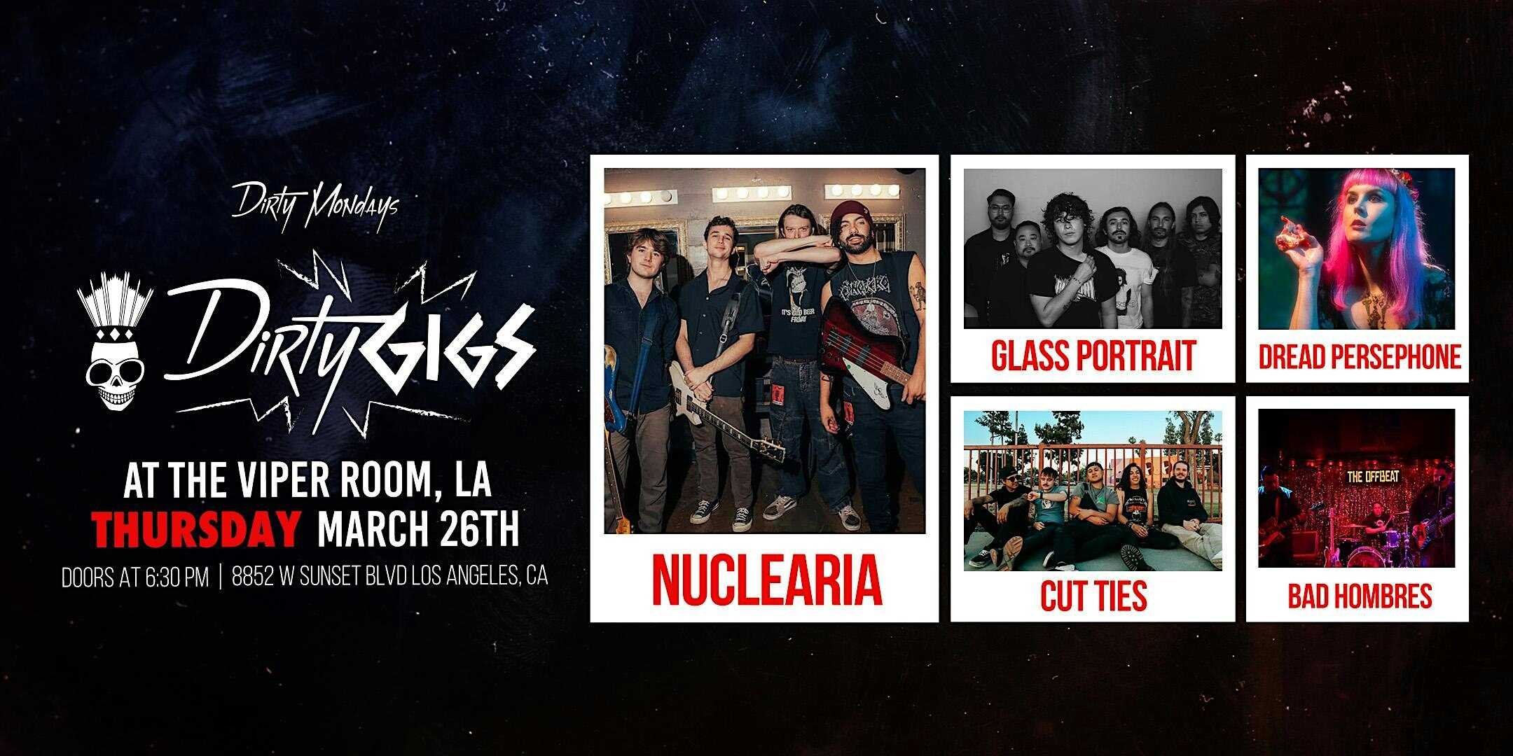 by admin23Feb DIRTY GIGS with NUCLEARIA at The Viper Room – West Hollywood, CA DIRTY GIGS with NUCLEARIA at The Viper Room – West Hollywood, CA 2 2 people viewed this event. The new insane concert series by DIRTY MONDAYS! It’s all about the bands! 7pm – 2am. 21+. $15 Presale, $25 at the door Tickets-RSVP Link Date And Time Thursday, March 26th, 2026 06:00 PM (PST) Venue The Viper Room Location 8852 Sunset Boulevard, West Hollywood, CA 90069 Event Types Concert or PerformanceMusic Event Category California Share With Friends Facebook Twitter Linkedin Xing Pinterest Share This Post: