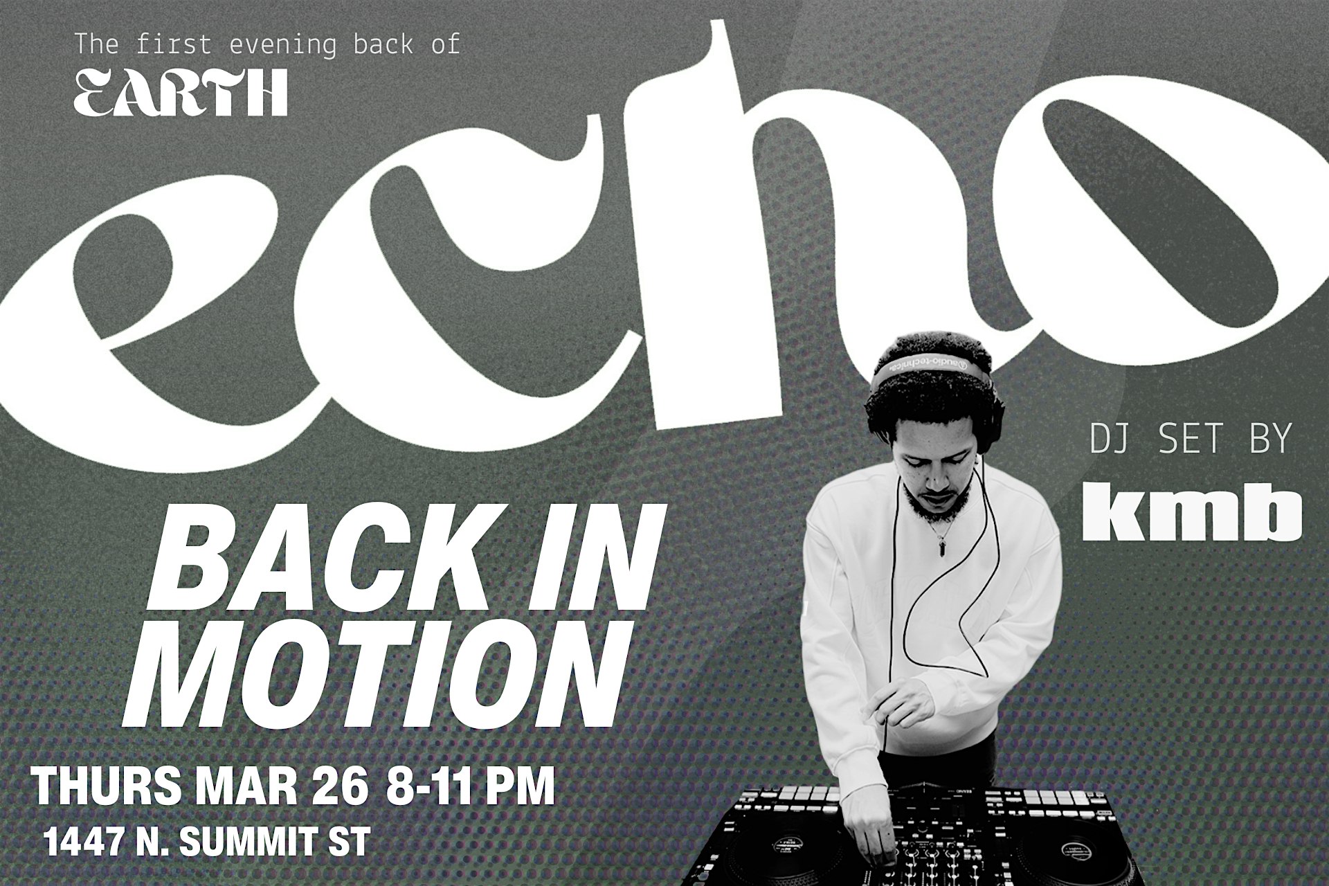 by admin24Feb ECHO: BACK IN MOTION – FEATURING KMB at Earth Coffeehouse & Cafe – Toledo, OH ECHO: BACK IN MOTION – FEATURING KMB at Earth Coffeehouse & Cafe – Toledo, OH 2 2 people viewed this event. Echo is an Earth Coffeehouse DJ series created for those who want to feel the rhythm of the city in a welcoming, substance-conscious space. Tickets-RSVP Link Date And Time Thursday, March 26th, 2026 08:00 PM (PST) Venue Earth Coffeehouse & Cafe Location 1447 North Summit Street, Toledo, OH 43604 Event Types Concert or PerformanceMusic Event Category OhioToledo Share With Friends Facebook Twitter Linkedin Xing Pinterest Share This Post: