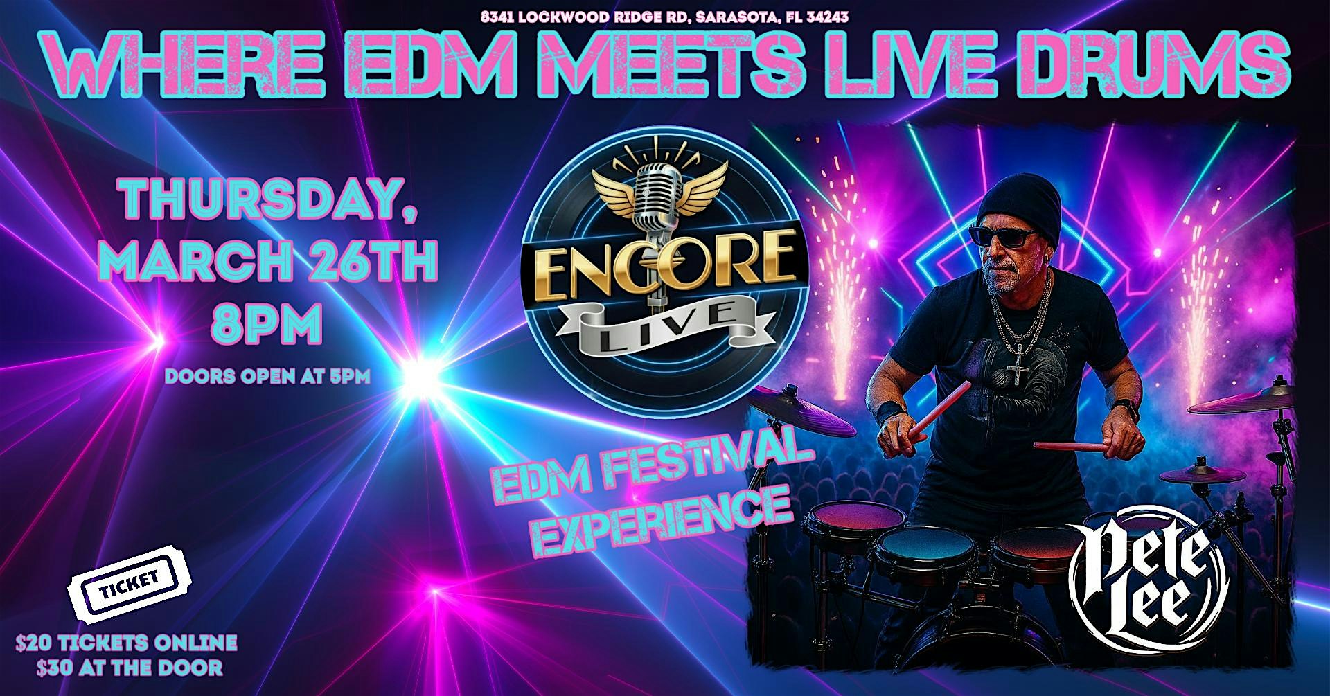 by admin24Feb EDM NIGHT – PETE LEE: The Worlds ONLY EDM Drummer at Encore Live – Sarasota, FL EDM NIGHT – PETE LEE: The Worlds ONLY EDM Drummer at Encore Live – Sarasota, FL 2 2 people viewed this event. Pete Lee, the world’s only EDM Drummer, blends massive electronic beats with live drums for a high-energy show seen nowhere else. Tickets-RSVP Link Date And Time Thursday, March 26th, 2026 08:00 PM (PST) Venue Encore Live Location 8341 Lockwood Ridge Road, Sarasota, FL 34243 Event Types Concert or PerformanceMusic Event Category Florida Share With Friends Facebook Twitter Linkedin Xing Pinterest Share This Post: