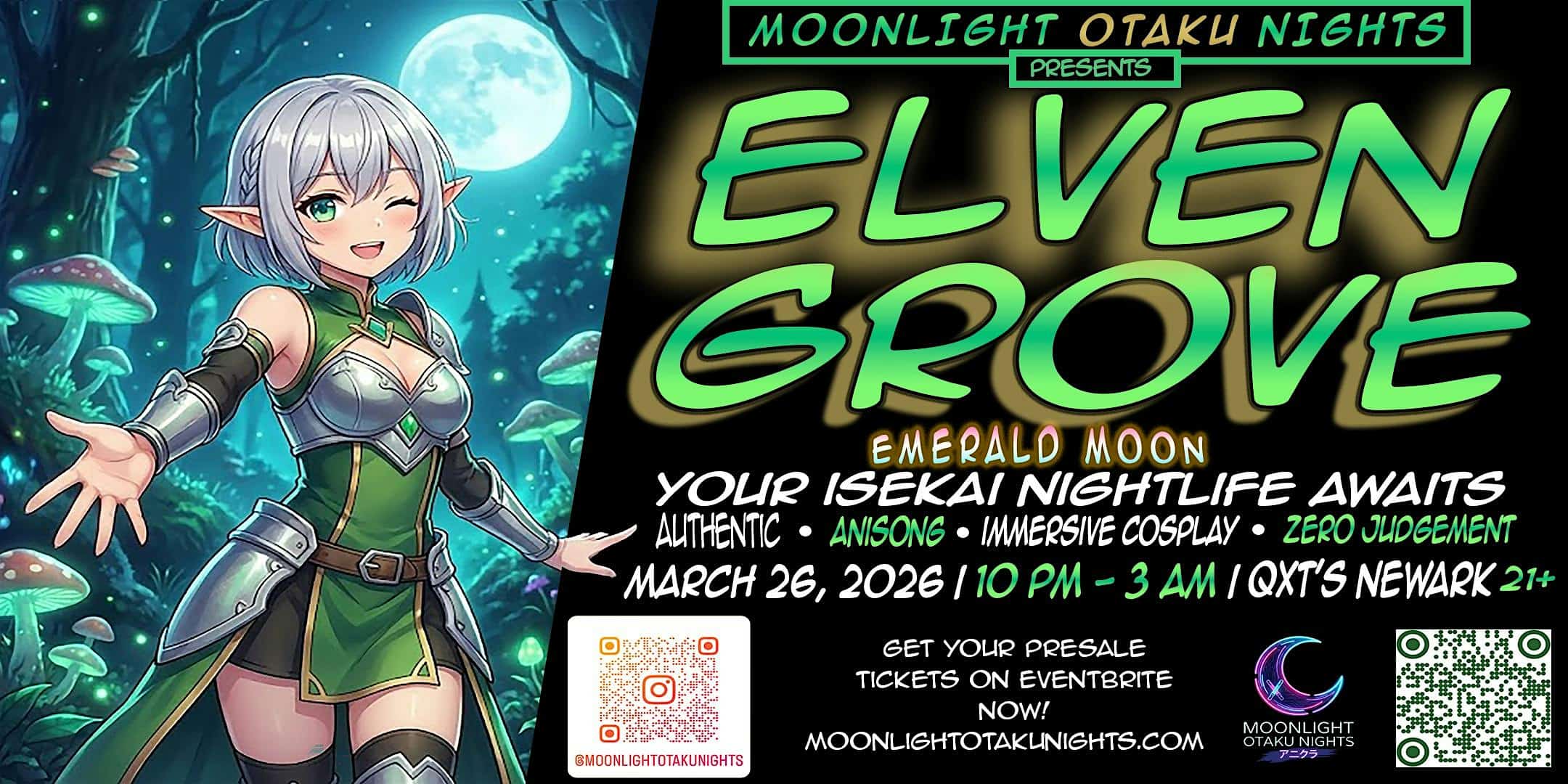 by admin23Feb Elven Grove: Emerald Moon — Anime Cosplay Night at QXT’s Newark at QXT’s Night Club – Newark, NJ Elven Grove: Emerald Moon — Anime Cosplay Night at QXT’s Newark at QXT’s Night Club – Newark, NJ 2 2 people viewed this event. NJ’s First Authentic Anikura Experience | Anisong • J-Core • Cosplay • 21+ Tickets-RSVP Link Date And Time Thursday, March 26th, 2026 10:00 PM (PST) Venue QXT's Night Club Location 248 Mulberry Street, Newark, NJ 7102 Event Types Party or Social GatheringPerforming & Visual Arts Event Category New Jersey Share With Friends Facebook Twitter Linkedin Xing Pinterest Share This Post: