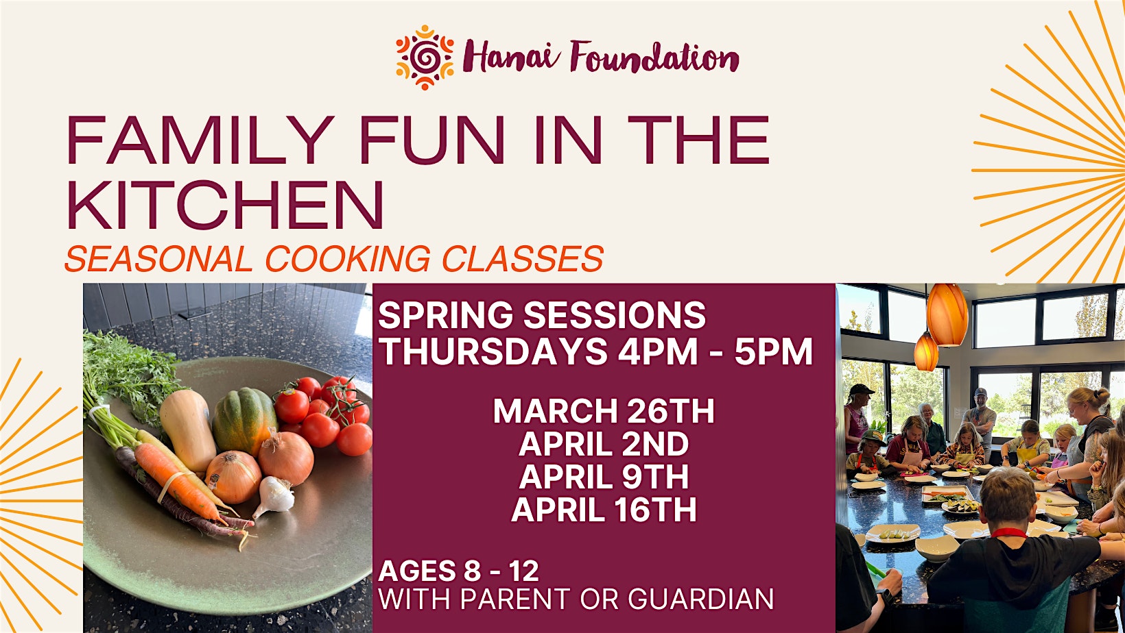 by admin24Feb Family Fun in the Kitchen – Spring Sessions at Hanai – Bend, OR Family Fun in the Kitchen – Spring Sessions at Hanai – Bend, OR 2 2 people viewed this event. Join the Hanai Foundation for our spring cooking classes! Come to one or come to all! Tickets-RSVP Link Date And Time Thursday, March 26th, 2026 04:00 PM (PST) Venue Hanai Location 62430 Eagle Road, Bend, OR 97701 Event Types Food & Drink Event Category Oregon Share With Friends Facebook Twitter Linkedin Xing Pinterest Share This Post: