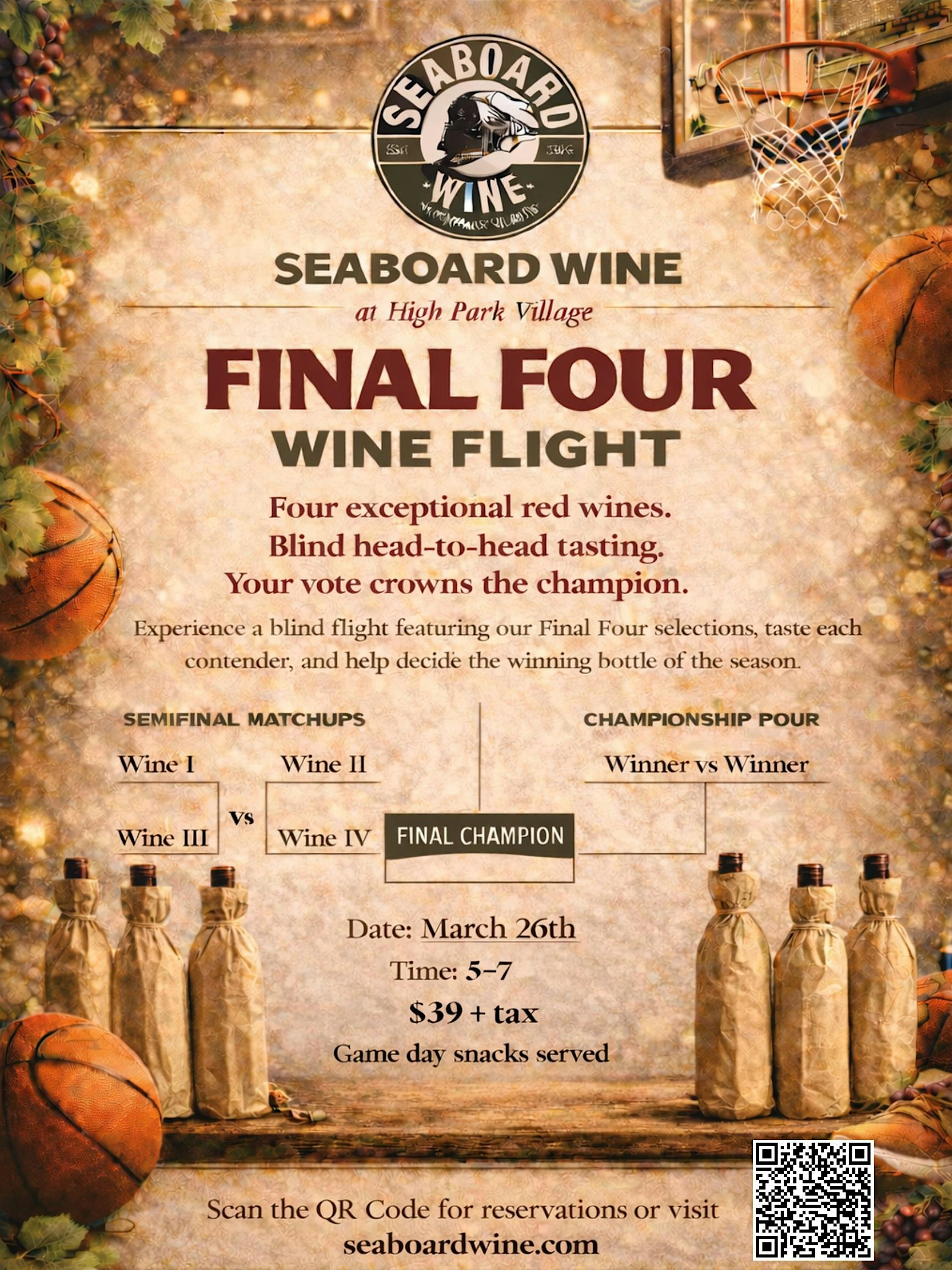 by admin24Feb Final Four Wine Flight at Seaboard Wine at HighPark Village – Raleigh, NC Final Four Wine Flight at Seaboard Wine at HighPark Village – Raleigh, NC 3 3 people viewed this event. Four exceptional red wines in a blind head to head tasting. Your vote crowns the champion! Tickets-RSVP Link Date And Time Thursday, March 26th, 2026 05:00 PM (PST) Venue Seaboard Wine at HighPark Village Location 1914 Bernard Street, Raleigh, NC 27608 Event Types Food & Drink Event Category North CarolinaRaleigh Share With Friends Facebook Twitter Linkedin Xing Pinterest Share This Post: