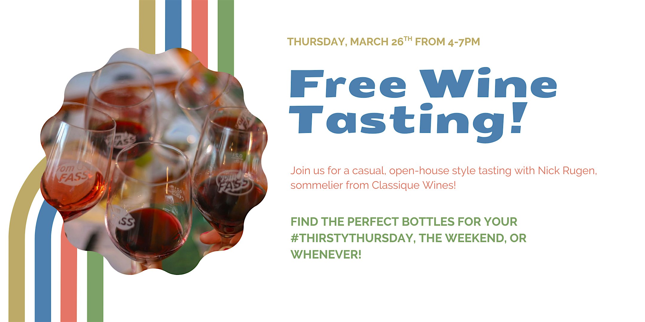 by admin13Feb Free Wine Tasting with Classique Wines! at Vom Fass St. Louis – MAPLEWOOD, MO Free Wine Tasting with Classique Wines! at Vom Fass St. Louis – MAPLEWOOD, MO 1 1 people viewed this event. Spend your Thirsty Thursday with us and sommelier Nick Rugen from Classique Wines! Tickets-RSVP Link Date And Time Thursday, March 26th, 2026 09:00 PM (PST) Venue Vom Fass St. Louis Location 7314 MANCHESTER RD, MAPLEWOOD, MO 631433108 Event Types Food & DrinkParty or Social Gathering Event Category Missouri Share With Friends Facebook Twitter Linkedin Xing Pinterest Share This Post: