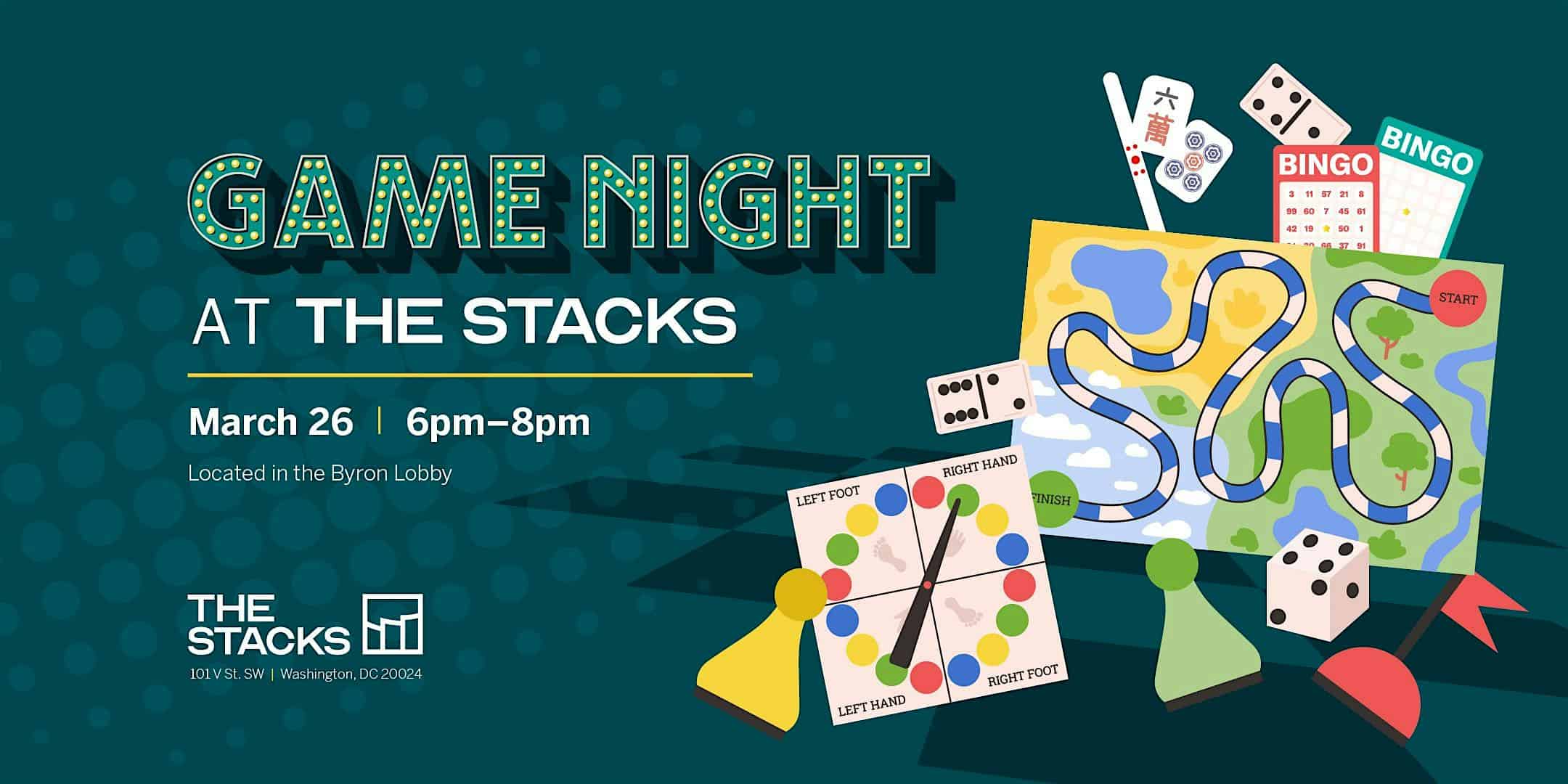 by admin23Feb Game Night at The Stacks at The Stacks – Washington, DC Game Night at The Stacks at The Stacks – Washington, DC 2 2 people viewed this event. Game night this month is Monopoly & Mocktails. So put your thinking caps on, bring your friends and let’s play! Tickets-RSVP Link Date And Time Thursday, March 26th, 2026 06:00 PM (PST) Venue The Stacks Location 101 V Street Southwest, Washington, DC 20024 Event Types Community & CultureParty or Social Gathering Event Category Washington DC Share With Friends Facebook Twitter Linkedin Xing Pinterest Share This Post: