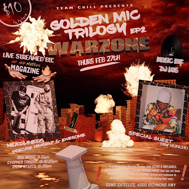 by admin24Feb Golden Mic Trilogy at Satellite Restaurant – Richmond, VA Golden Mic Trilogy at Satellite Restaurant – Richmond, VA 2 2 people viewed this event. The longest running showcase in VA history is back. The Golden Mic Trilogy… come out and be apart of the movement and we writing the script Tickets-RSVP Link Date And Time Thursday, March 26th, 2026 07:00 PM (PST) Venue Satellite Restaurant Location 4000 Richmond Highway, Richmond, VA 23234 Event Types Concert or PerformanceMusic Event Category Virginia Share With Friends Facebook Twitter Linkedin Xing Pinterest Share This Post: