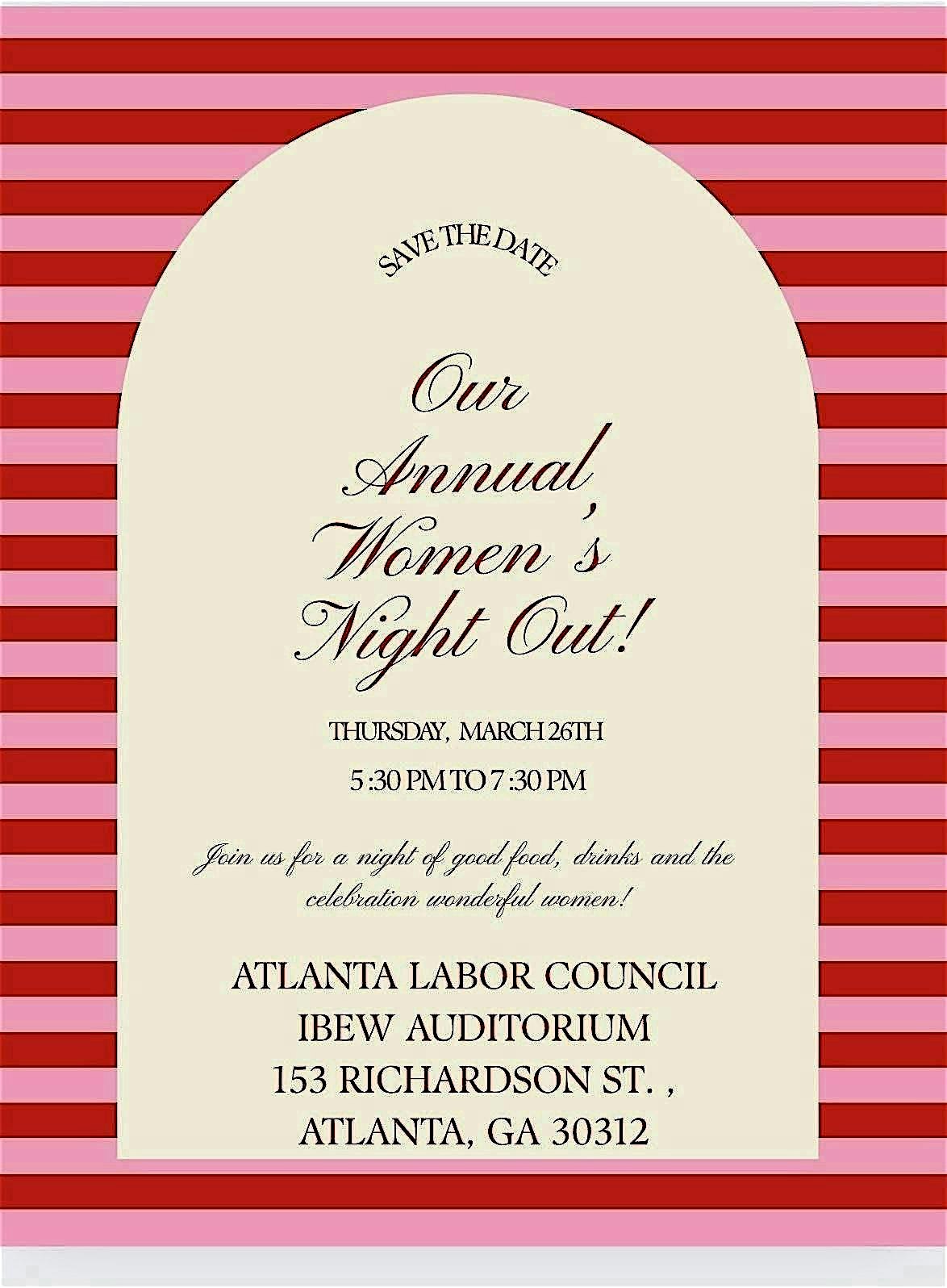 by admin24Feb Labor Council Annual Women’s Night Out: Paint and Prosecco Edition at 153 Richardson St SE – Atlanta, GA Labor Council Annual Women’s Night Out: Paint and Prosecco Edition at 153 Richardson St SE – Atlanta, GA 3 3 people viewed this event. Join us for an unforgettable evening of creativity, connection, and celebration! Paint & Prosecco Women’s Night Out is the perfect escape! Tickets-RSVP Link Date And Time Thursday, March 26th, 2026 05:00 PM (PST) Venue 153 Richardson St SE Location 153 Richardson Street Southeast, Atlanta, GA 30312 Event Types Food & Drink Event Category AtlantaGeorgia Share With Friends Facebook Twitter Linkedin Xing Pinterest Share This Post: