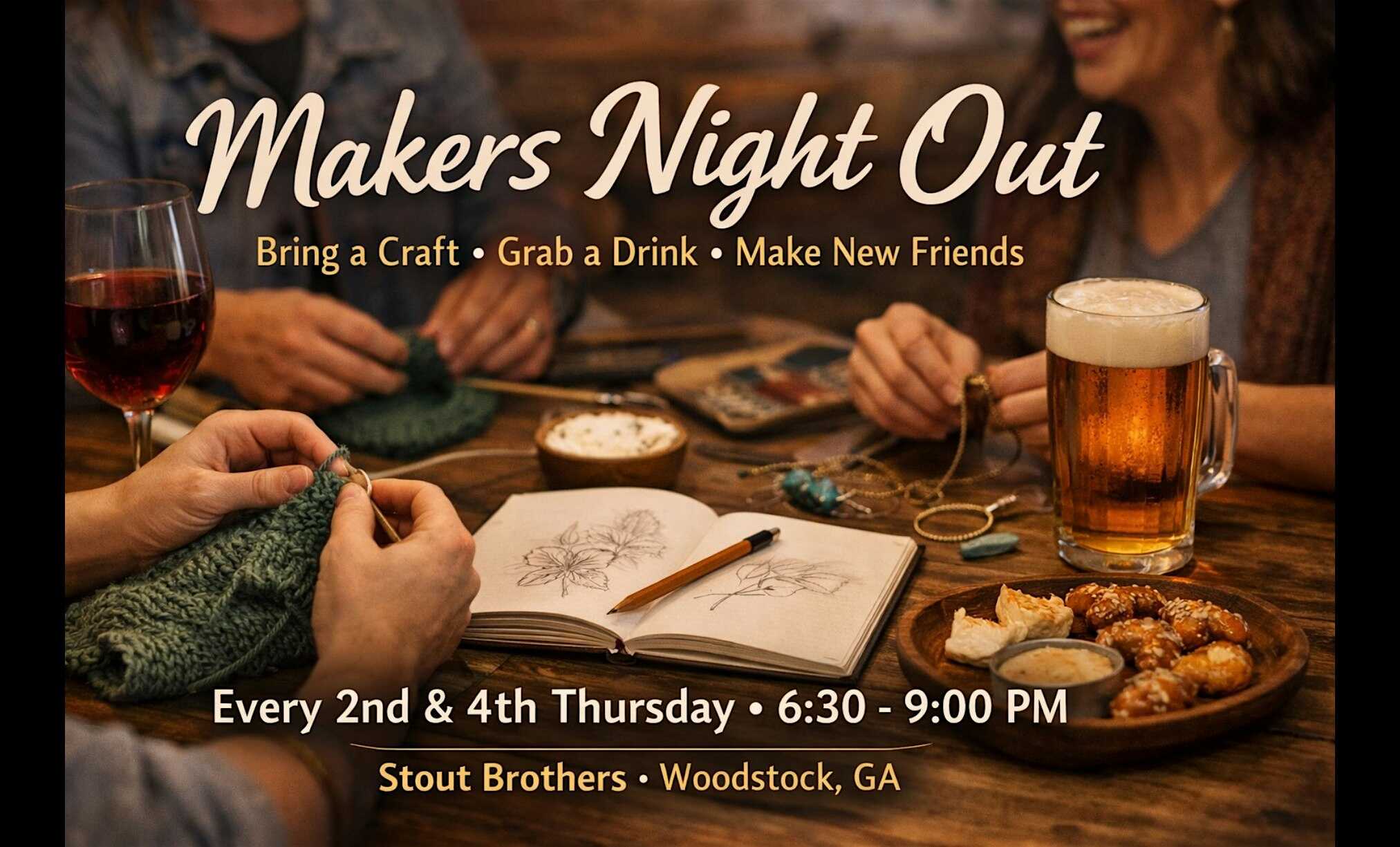 by admin14Feb Makers Night Out at The Stout Brothers Woodstock Beer & Coffee Market – Woodstock, GA Makers Night Out at The Stout Brothers Woodstock Beer & Coffee Market – Woodstock, GA 1 1 people viewed this event. Hang out, create cool stuff, and meet fellow makers at Makers Night Out – fun vibes guaranteed! Tickets-RSVP Link Date And Time Thursday, March 26th, 2026 10:00 PM (PST) Venue The Stout Brothers Woodstock Beer & Coffee Market Location 240 Chambers Street, Woodstock, GA 30188 Event Types Party or Social Gathering Event Category Georgia Share With Friends Facebook Twitter Linkedin Xing Pinterest Share This Post:
