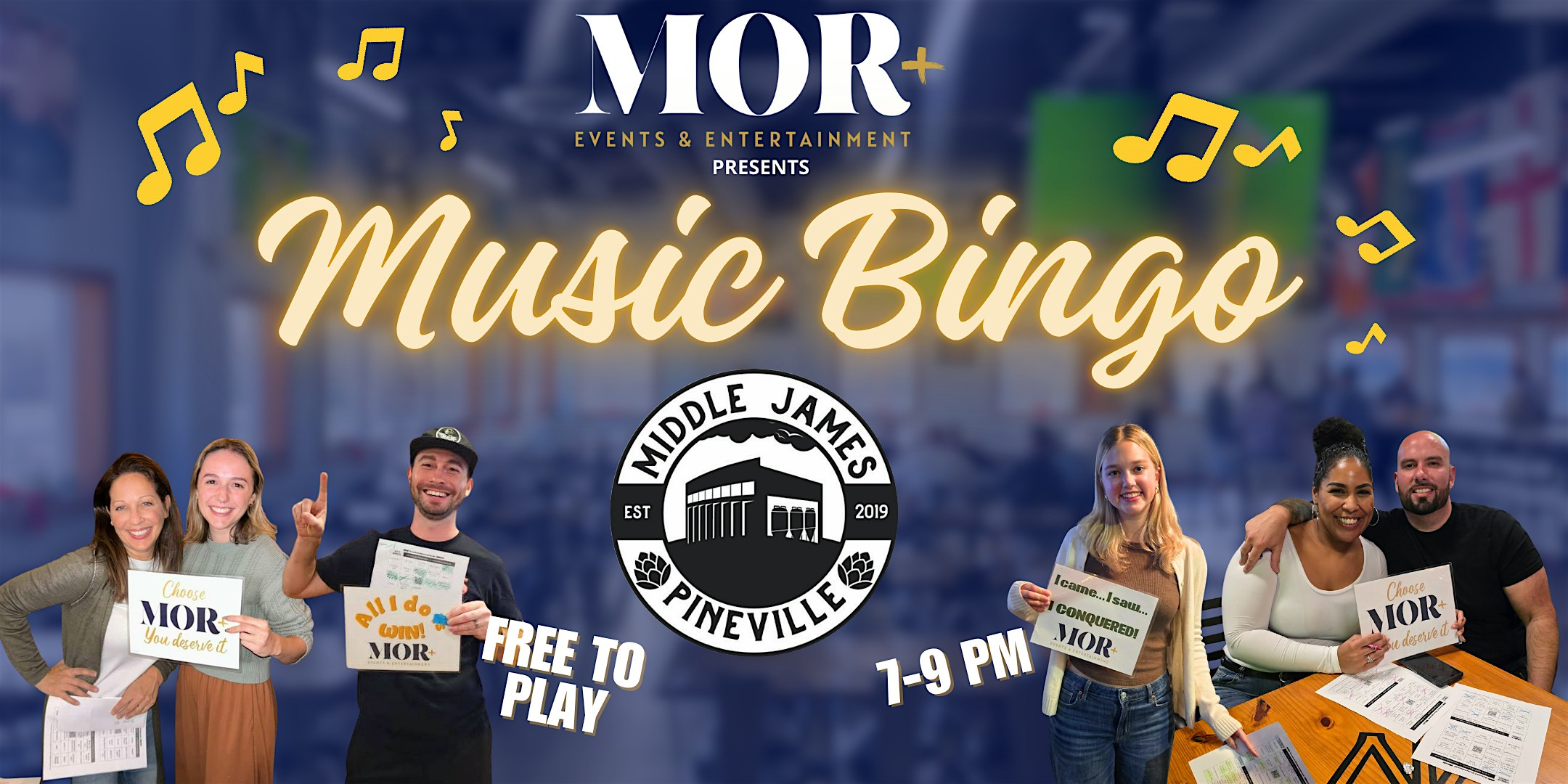 MOR+ Music Bingo @ Middle James Brewing – Pineville at Middle James Brewing Company – Pineville, NC MOR+ Music Bingo @ Middle James Brewing – Pineville at Middle James Brewing Company – Pineville, NC 2 2 people viewed this event. From throwback hits to current favorites, music bingo keeps everyone having fun with nonstop music, games, great vibes, & memorable moments! Tickets-RSVP Link Register for event Date And Time Thursday, March 26th, 2026 @ 07:00 PM Location 400 North Polk Street, Pineville, NC 28134 Event Types Game or CompetitionMusic Event Category North Carolina Share With Friends Facebook Twitter Linkedin Xing Pinterest