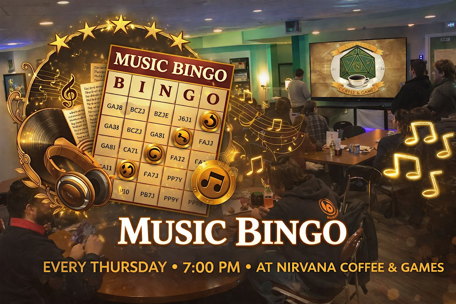 by admin24Feb Music Bingo at Nirvana Coffee & Games – Independence, MO Music Bingo at Nirvana Coffee & Games – Independence, MO 3 3 people viewed this event. Get ready, music lovers. Every Thursday at 7PM, Nirvana Coffee and Games turns up the volume for Music Bingo hosted by Crit and Ale Tickets-RSVP Link Date And Time Thursday, March 26th, 2026 07:00 PM (PST) Venue Nirvana Coffee & Games Location 10707 East Winner Road, Independence, MO 64052 Event Types Music Event Category Missouri Share With Friends Facebook Twitter Linkedin Xing Pinterest Share This Post: