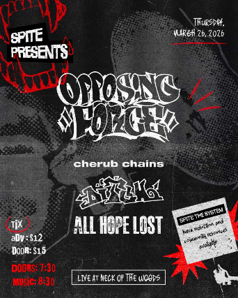 Spite Presents:Opposing ForceCherub ChainsAll Hope LostThursday March 26th 2026Neck of the Woods 406 Clement St San Francisco, CA 94118$12 in adv $15 at the doorDoors at 7:30pmALL AGES