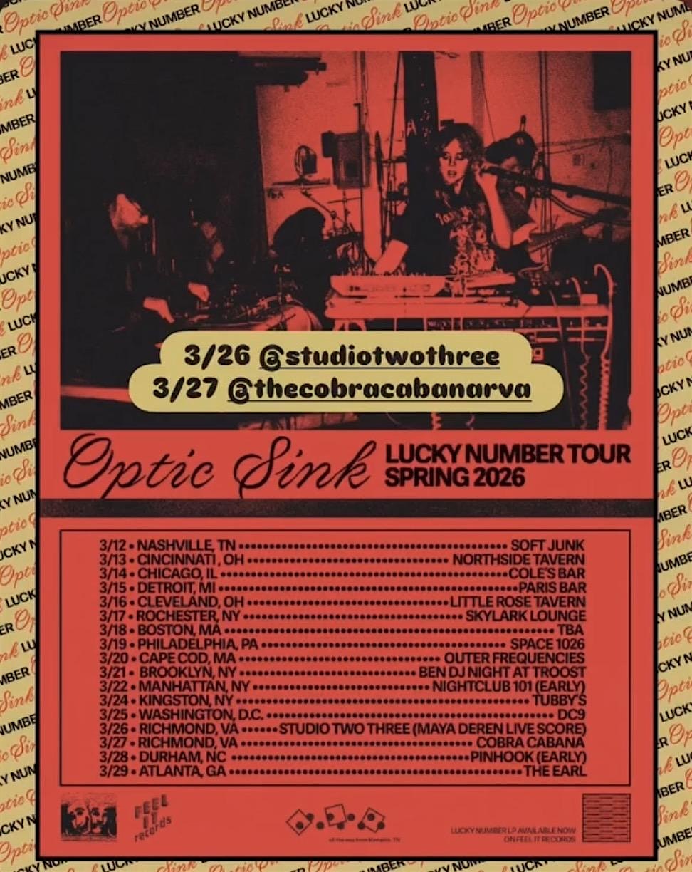 by admin24Feb OPTIC SINK Record Release w/ Live Score & DJ TIMGENERATE @ Studio Two Three at 109 W 15th St – Richmond, VA OPTIC SINK Record Release w/ Live Score & DJ TIMGENERATE @ Studio Two Three at 109 W 15th St – Richmond, VA 3 3 people viewed this event. Get ready to vibe 3/26 with OPTIC SINK’s record release and a Live Score performance and DJ TIMGENERATE spinning at Studio Two Three! Tickets-RSVP Link Date And Time Thursday, March 26th, 2026 07:00 PM (PST) Venue 109 W 15th St Location 109 West 15th Street, Richmond, VA 23224 Event Types Concert or PerformanceMusic Event Category Virginia Share With Friends Facebook Twitter Linkedin Xing Pinterest Share This Post: