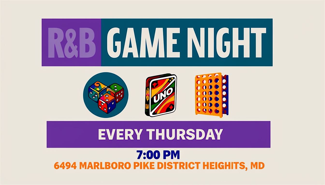 by admin13Feb RnB Game Night { BISTRO THURSDAYS} at 6494 Marlboro Pike – District Heights, MD RnB Game Night { BISTRO THURSDAYS} at 6494 Marlboro Pike – District Heights, MD 2 2 people viewed this event. RnB Game Night Date: Each and Every Thursdays Time: 6:00 PM Location: 6494 Marlboro Pike Come join us for a night of fun and games with an R Tickets-RSVP Link Date And Time Thursday, March 26th, 2026 10:00 PM (PST) Venue 6494 Marlboro Pike Location 6494 Marlboro Pike, District Heights, MD 20747 Event Types MusicParty or Social Gathering Event Category MarylandNational Harbor Share With Friends Facebook Twitter Linkedin Xing Pinterest Share This Post: