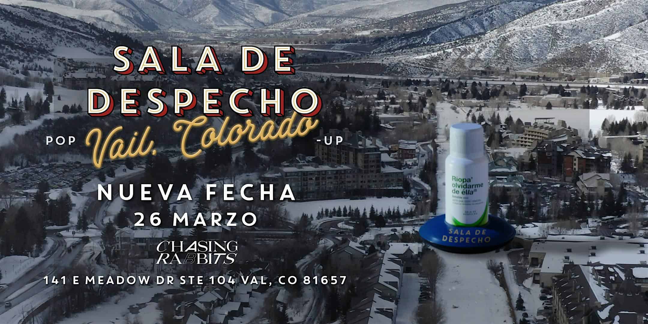 by admin23Feb Sala de Despecho Vail at Chasing Rabbits – Vail, CO Sala de Despecho Vail at Chasing Rabbits – Vail, CO 2 2 people viewed this event. Sala de Despecho pop-up comes back to Vail after our first sold out event! Tickets-RSVP Link Date And Time Thursday, March 26th, 2026 07:00 PM (PST) Venue Chasing Rabbits Location 141 East Meadow Drive, Vail, CO 81657 Event Types Concert or PerformanceMusic Event Category Colorado Share With Friends Facebook Twitter Linkedin Xing Pinterest Share This Post: