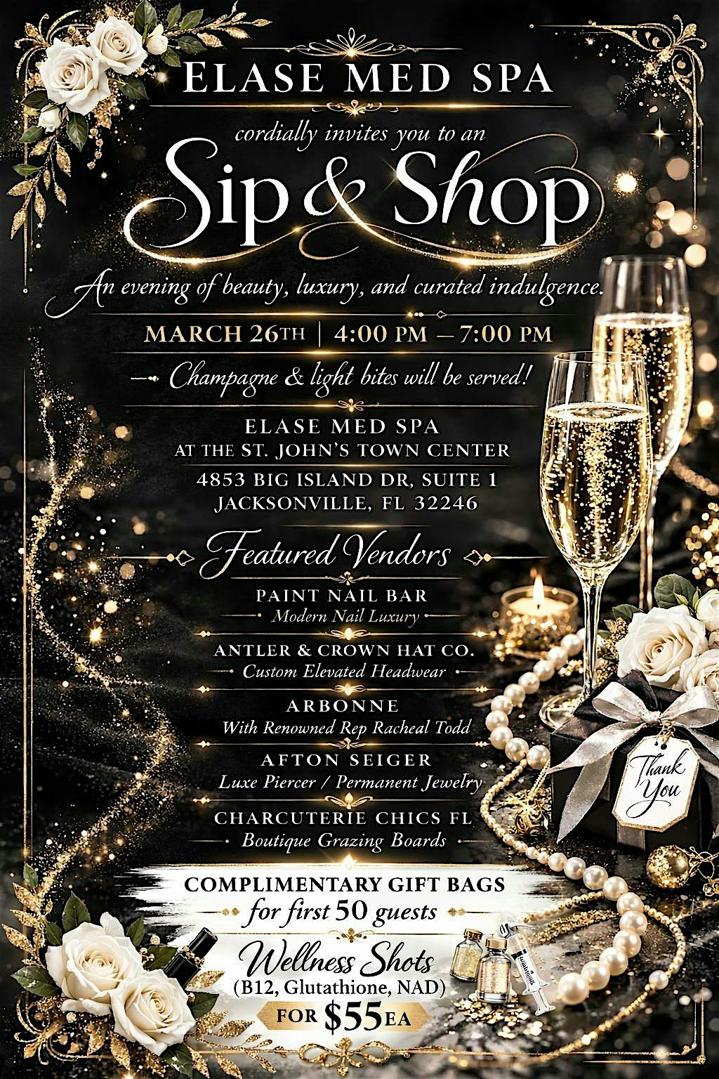 by admin27Feb Sip and Shop at 4853 Big Island Drive – Jacksonville, FL Sip and Shop at 4853 Big Island Drive – Jacksonville, FL 1 1 people viewed this event. Join us at Elase Med Spa for an exclusive evening of beauty, luxury, and curated indulgence at our Upcoming Sip and Shop Event! Tickets-RSVP Link Date And Time Thursday, March 26th, 2026 04:00 PM (PST) Venue 4853 Big Island Drive Location 4853 Big Island Drive, Jacksonville, FL 32246 Event Types Food & DrinkParty or Social Gathering Event Category FloridaJacksonville Share With Friends Facebook Twitter Linkedin Xing Pinterest Share This Post: